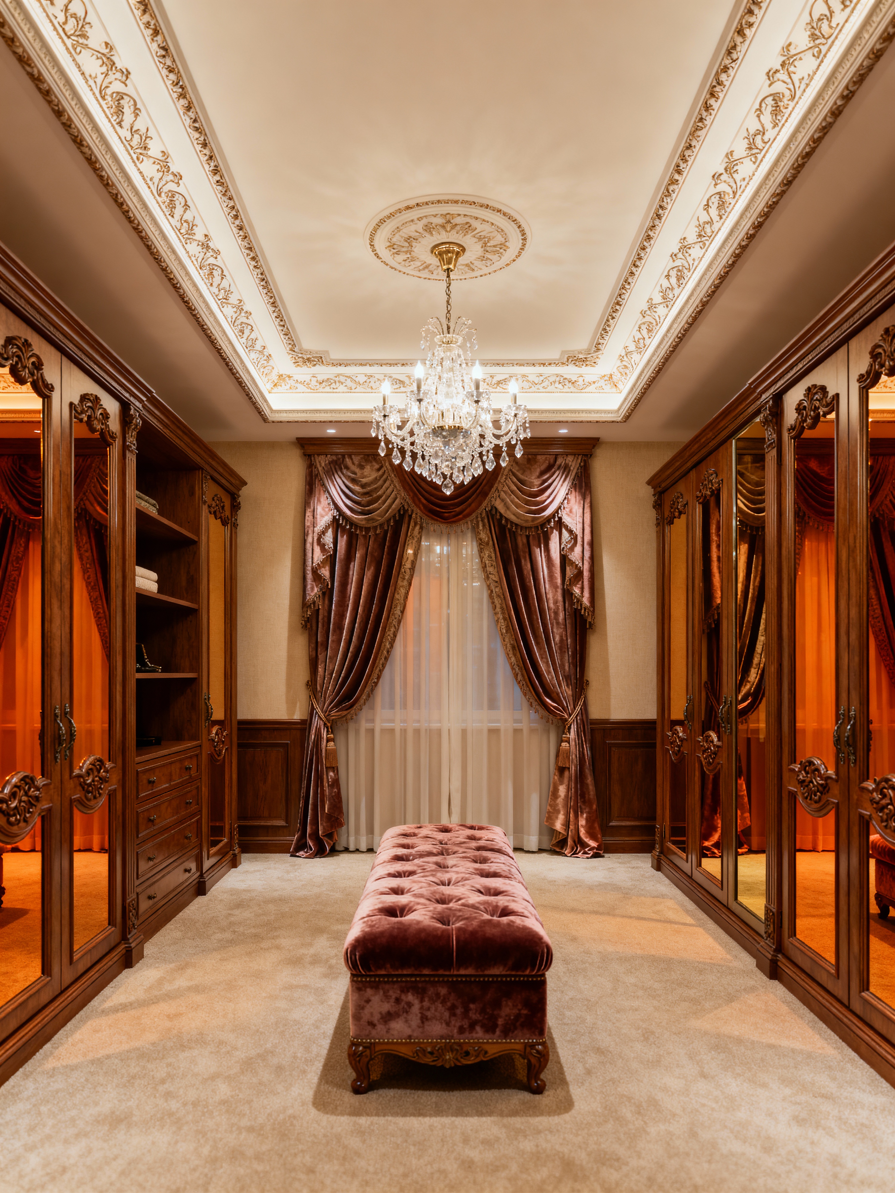 walk in closet with traditional style . with ornate details and refined atmosphere and timeless design and warm colors and symmetrical layout and luxurious textiles and classic elegance and crown molding