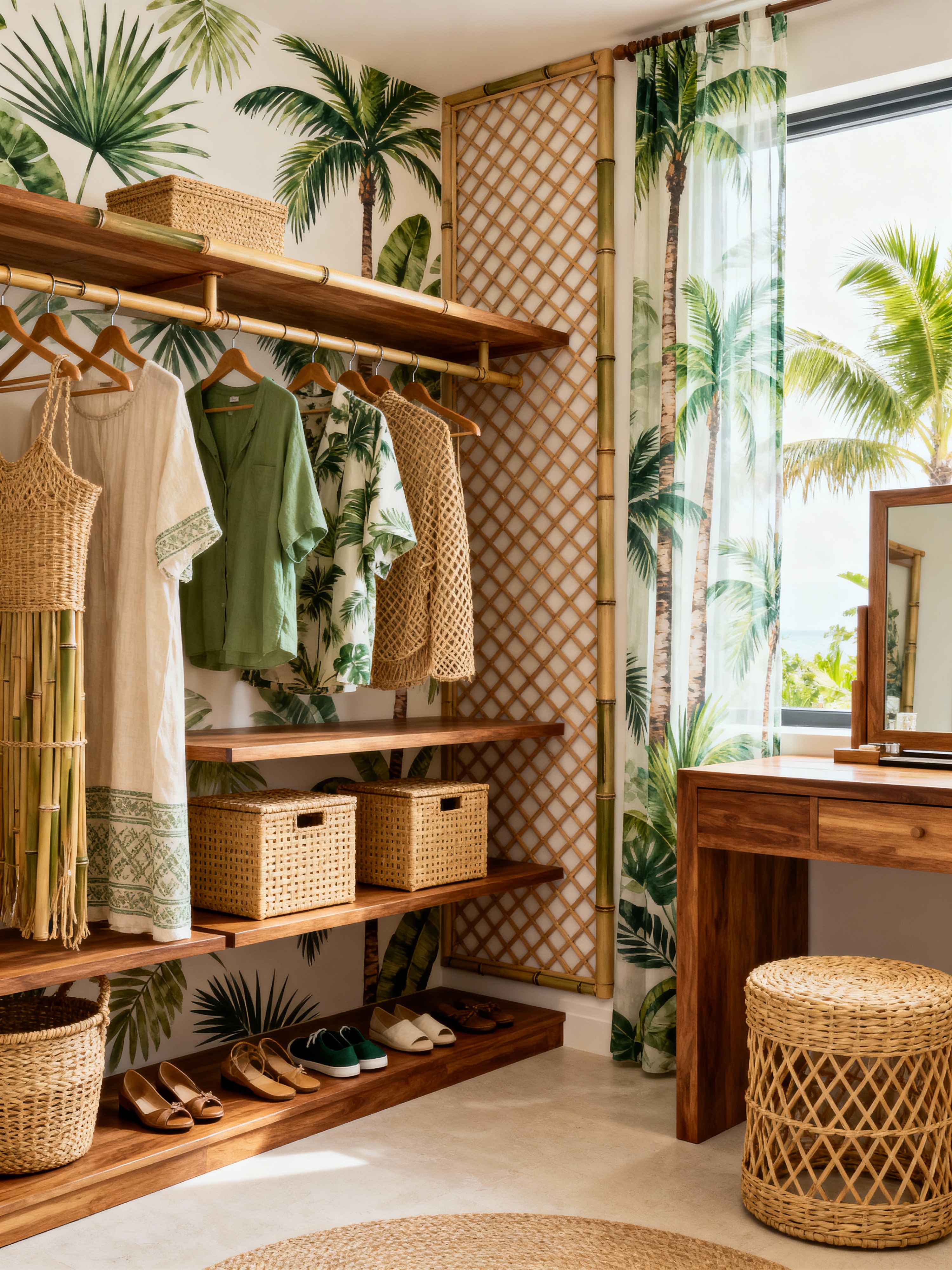 walk in closet with tropical style . with bamboo and cane motifs and palm leaves and palm trees and rattan and lattice prints and wicker and teak