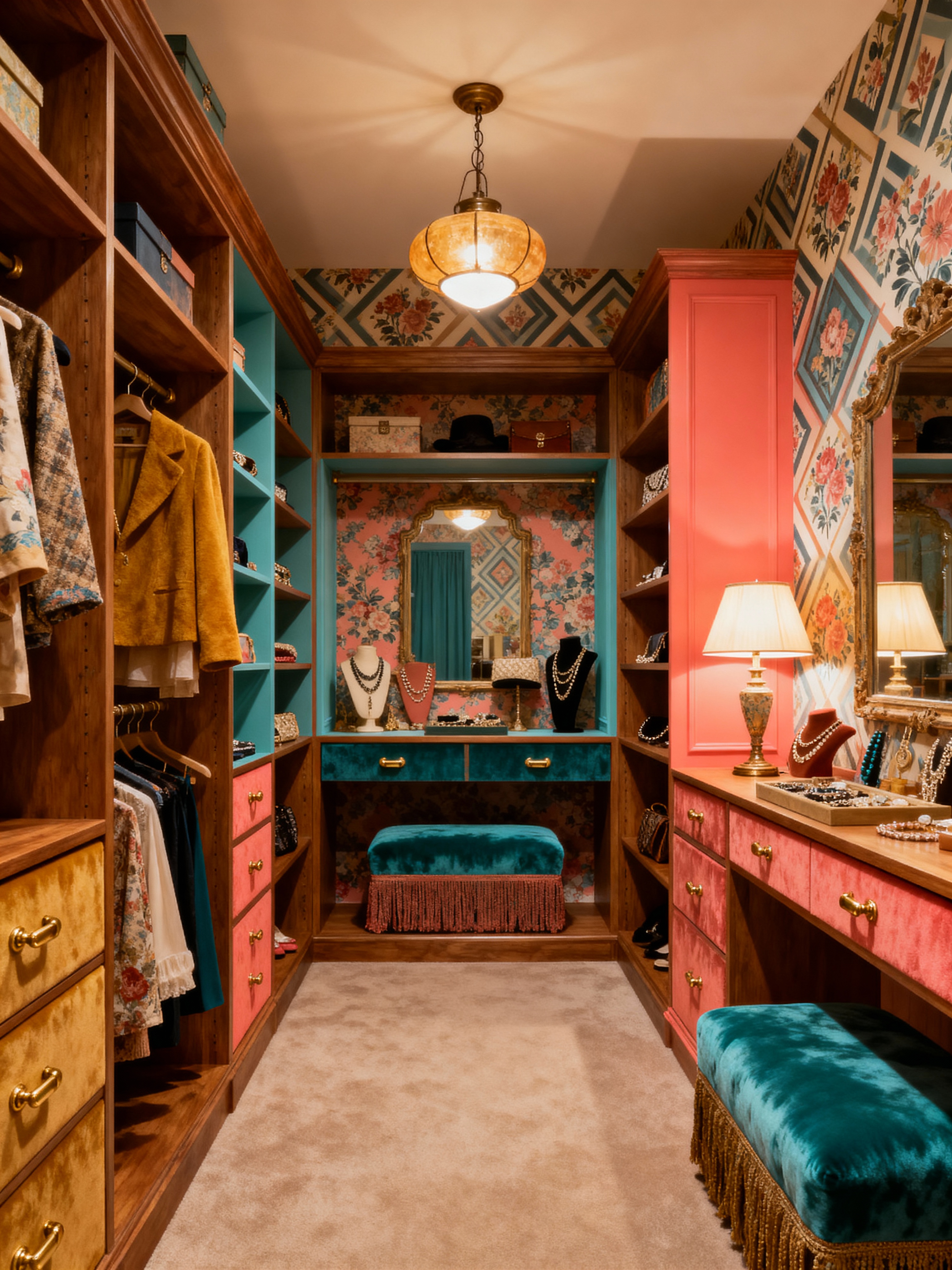 walk in closet with vintage style . with colorful accents and mid-century and ornate details and antique decor and retro style and bold patterns and timeless pieces and shabby chic