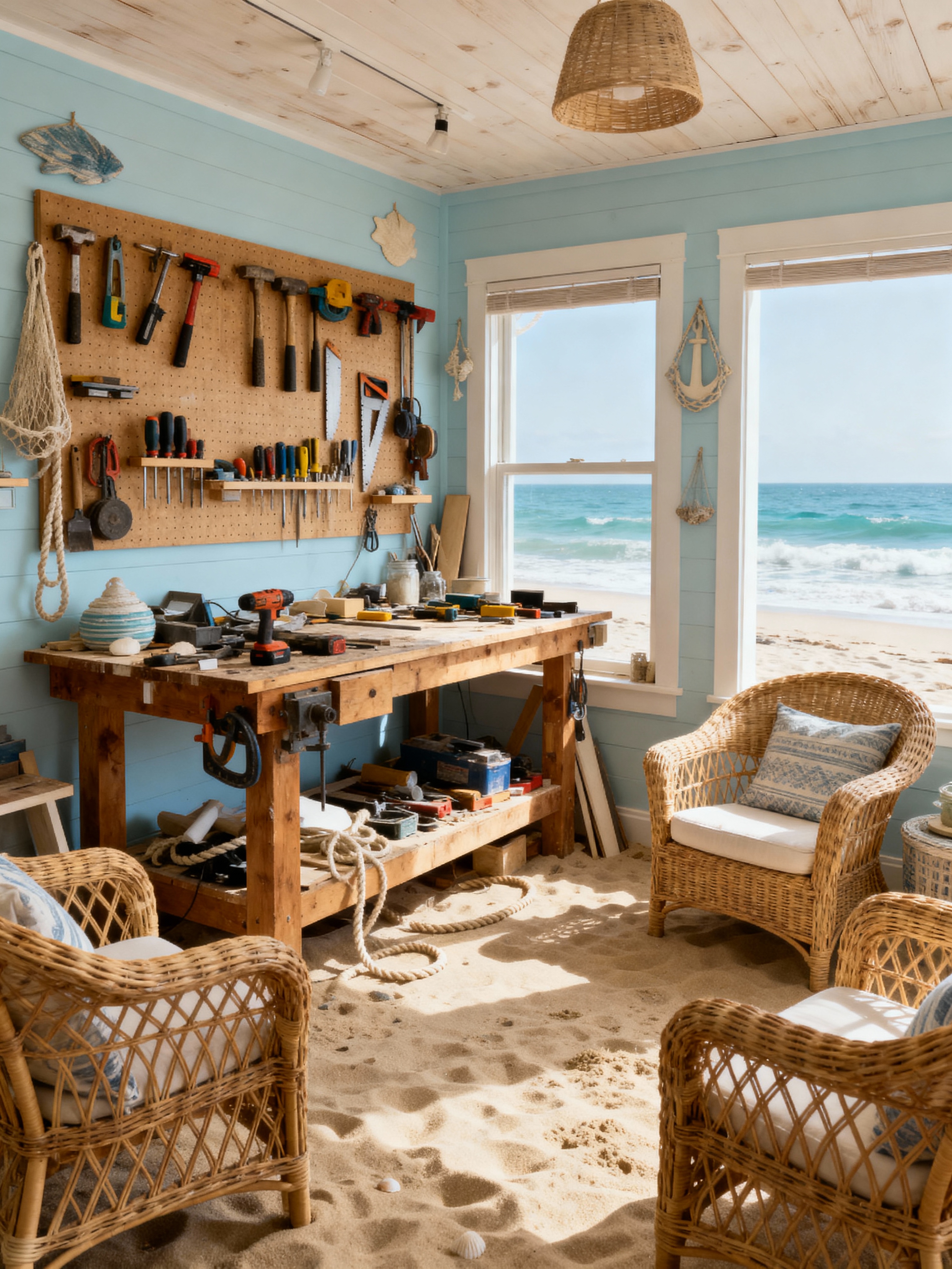 workshop with coastal style with tool wall and messy and wooden workbench and tool wall. . with sand tones and light blue and seaside colors and nautical decor and airy feel and wicker furniture and ocean-inspired and beach vibes