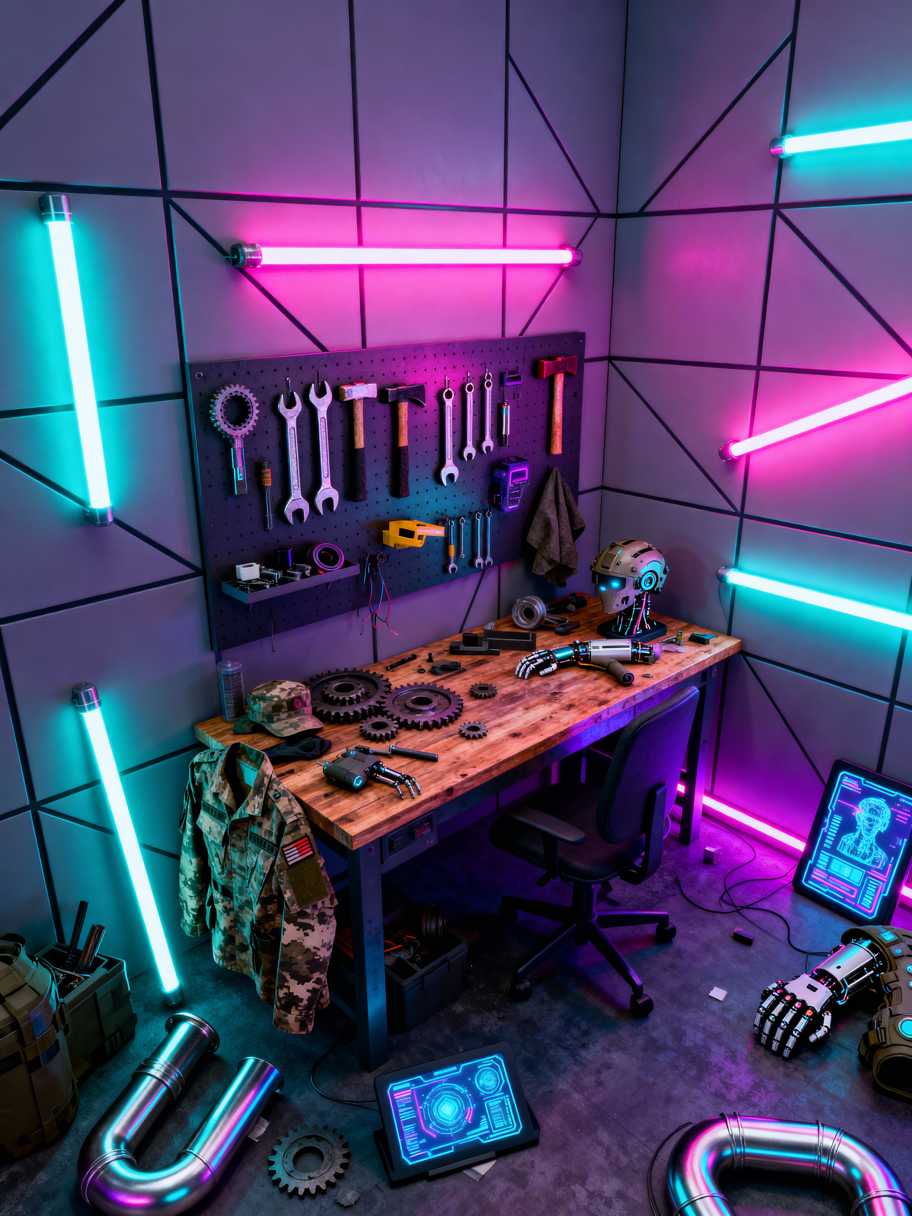 workshop with cyberpunk style with messy and tool wall and wooden workbench and messy. . with synthetic objects and minimalist and military uniforms and gear and cyberpunk lights and synthwave and strong geometric walls and color lights glow and led lights