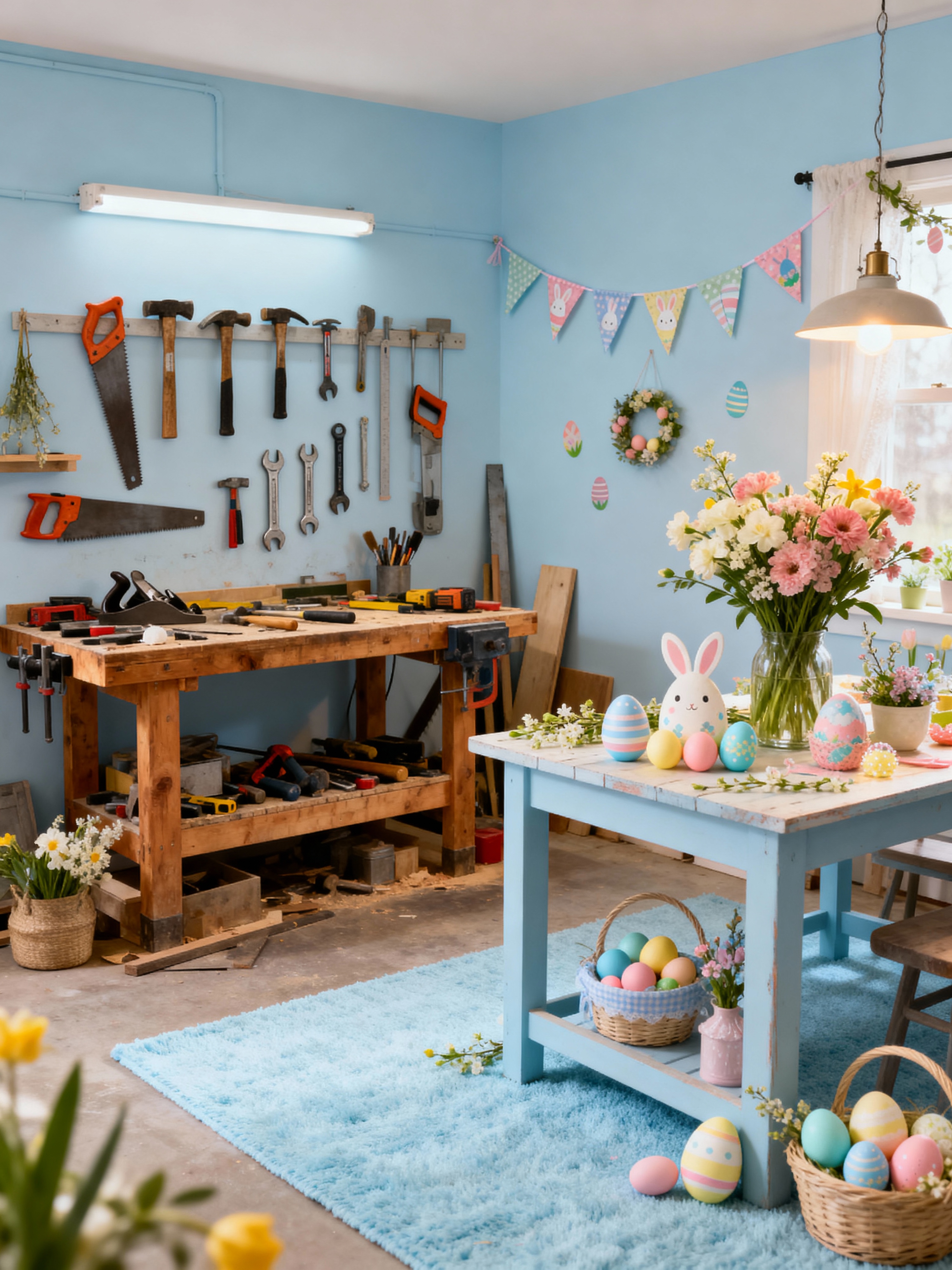 workshop with easter style with messy and tool wall and wooden workbench and messy. . with easter decorations and light blue colors and flowers on table and colorful easter eggs and spring decorations and easter decorations