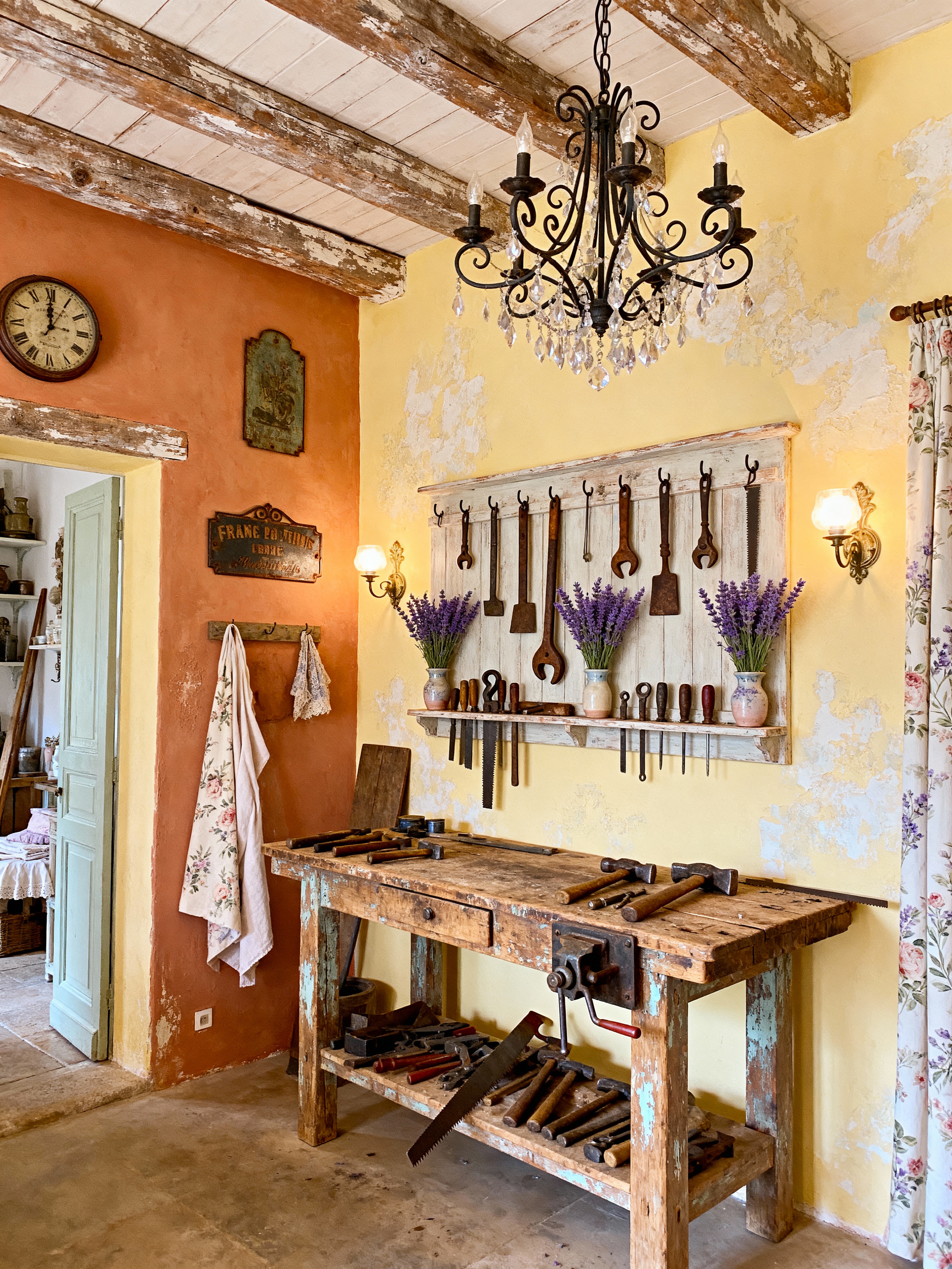 workshop with french country style with wooden workbench and tool wall and messy and wooden workbench. . with lavender accents and distressed wood and country elegance and chandeliers and elegant rustic and antique decor and textured walls and warm tones
