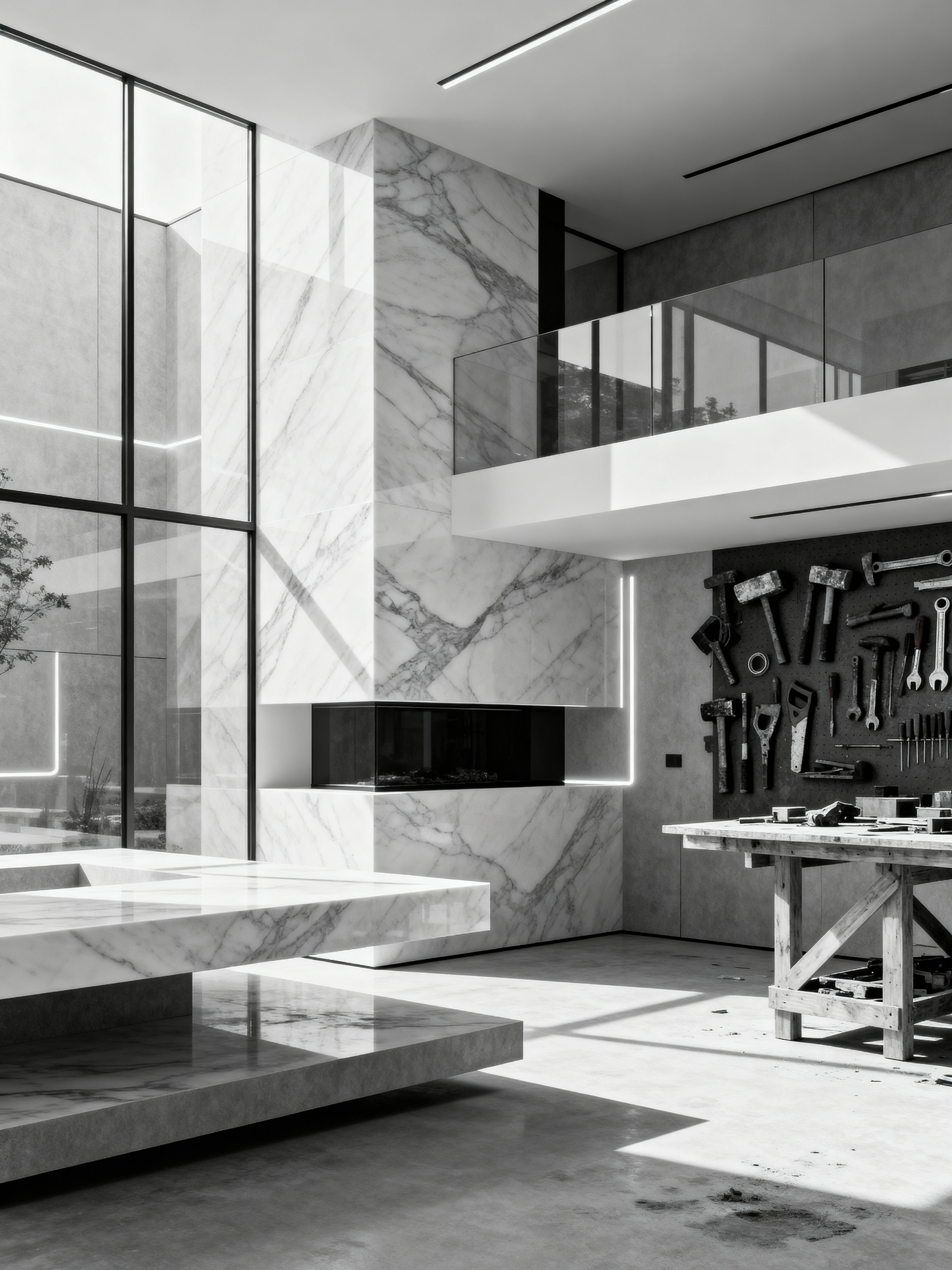 workshop with futuristic style with messy and tool wall and wooden workbench and messy. . with floating surfaces and monochromatic palette and glass panes and smooth polished marble and smooth marble and strong geometric walls and neutral background and bright accents and futurism minimalist interior