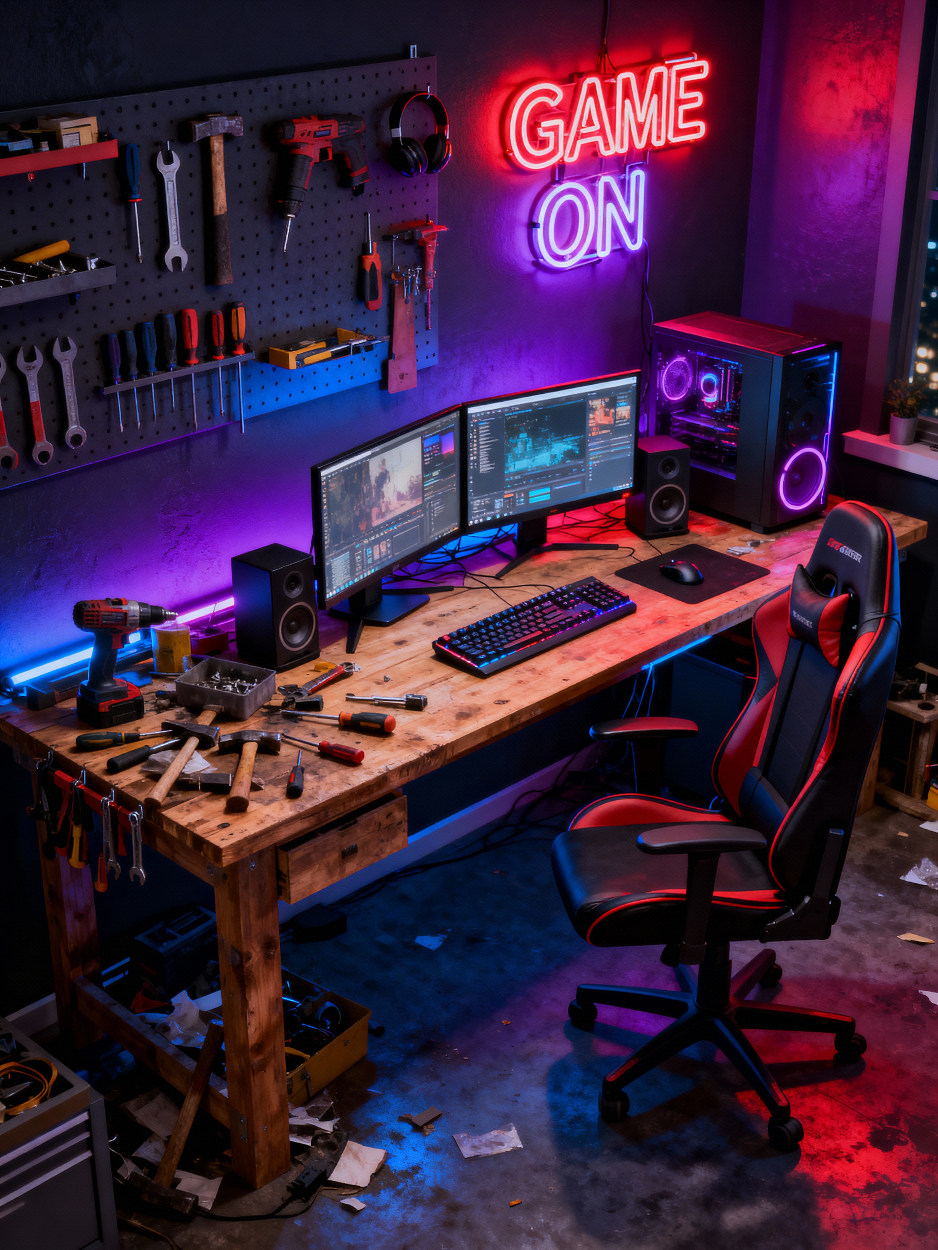 workshop with gaming room style with tool wall and messy and wooden workbench and tool wall. . with dark walls and purple, red and blue fade light and computer desk with computer displays and keyboard and dark room and neon letters on wall and at night and gaming chair and speakers