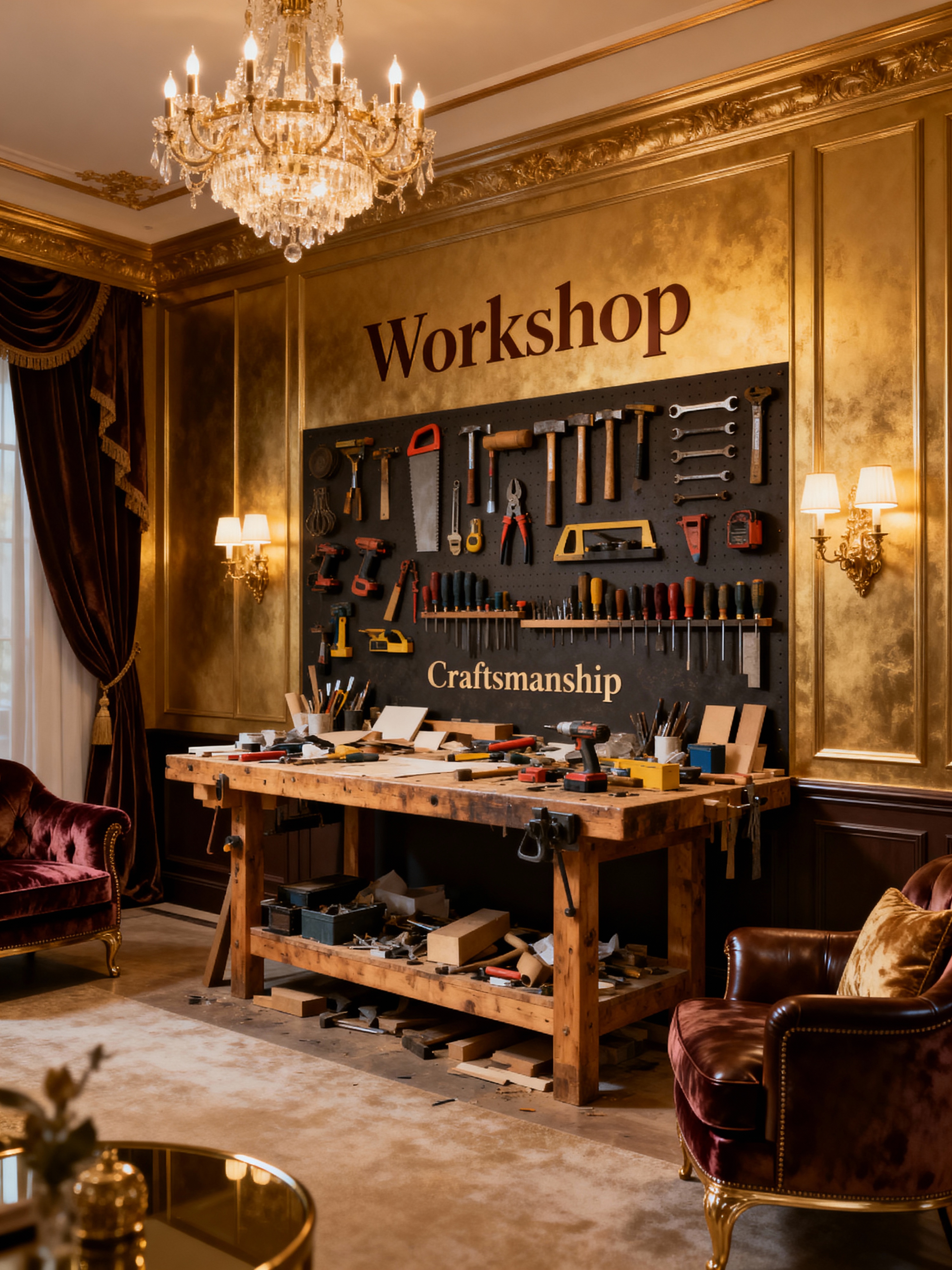 workshop with luxury style with tool wall and messy and wooden workbench and tool wall. . with high-end materials and custom pieces and elegant lighting and sophisticated style and opulent details and designer furniture and rich textures and premium finishes