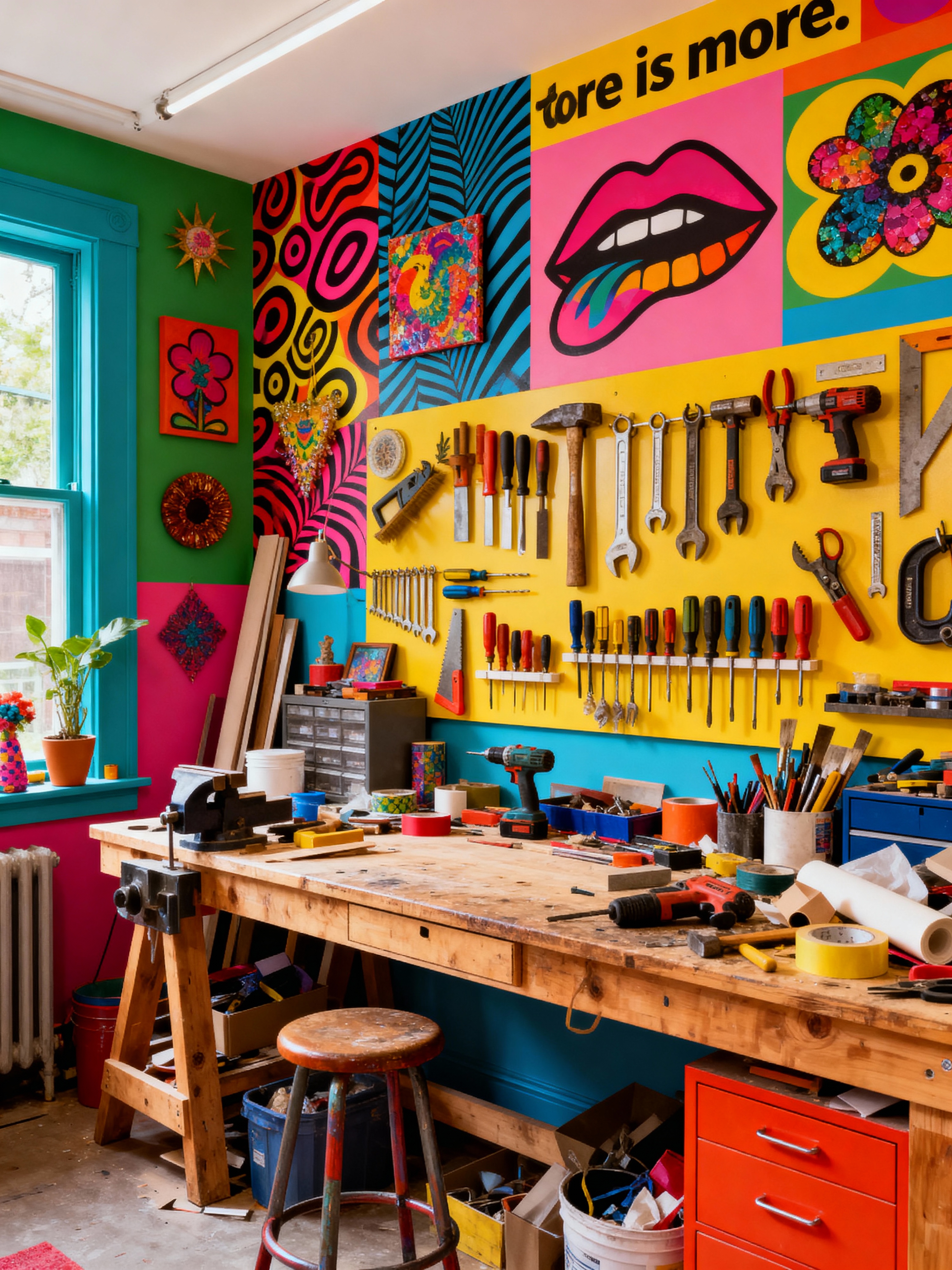 workshop with maximalist style with tool wall and wooden workbench and messy and tool wall. . with bold colors and playful and eye-catching and over-the-top aesthetic and bold patterns and bold design and more is more philosophy and vibrant