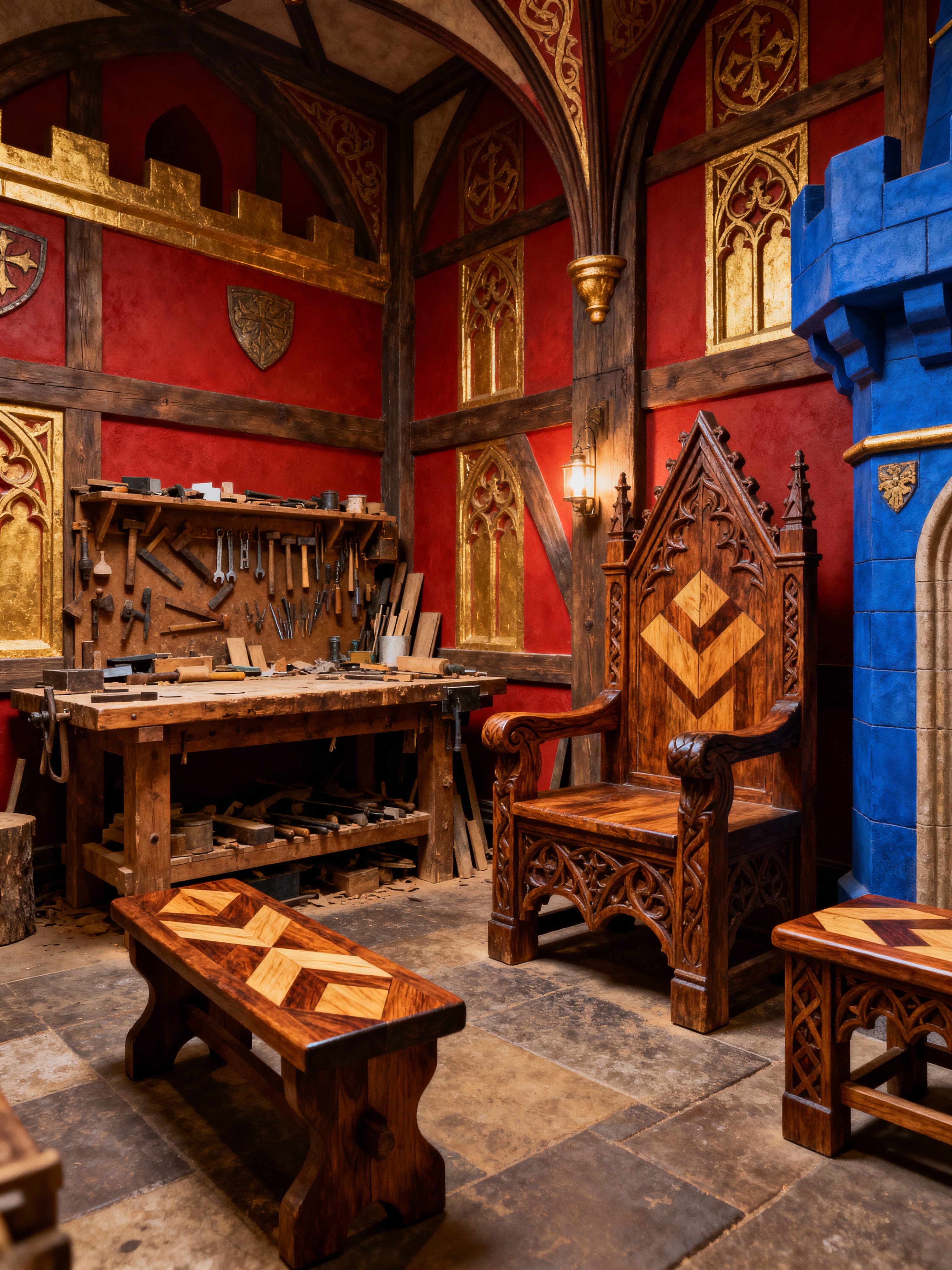 workshop with medieval style with wooden workbench and messy and tool wall and wooden workbench. . with gothic appearance and carved wooden chairs and deep colors like red, gold, or blue and timber walls and carved wooden benches and castle interior and heavy furniture pieces and intricate wooden inlay designs and carvings