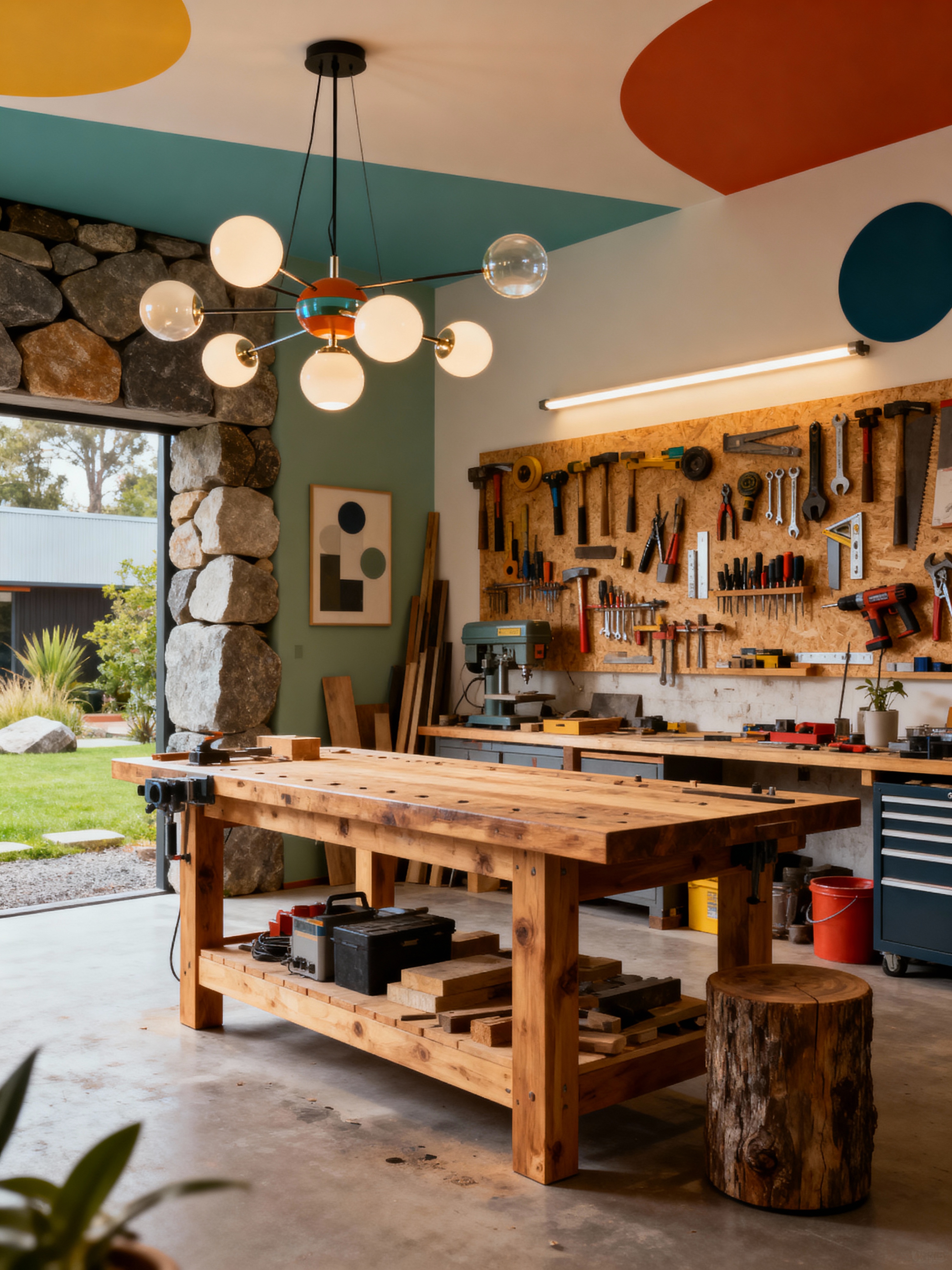 workshop with midcentury modern style with wooden workbench and messy and tool wall and wooden workbench. . with minimalist and vibrant colors and integrating indoor and outdoor motifs and clean lines and graphic shapes and muted tones and mid century modern mobile chandelier and natural and manmade materials