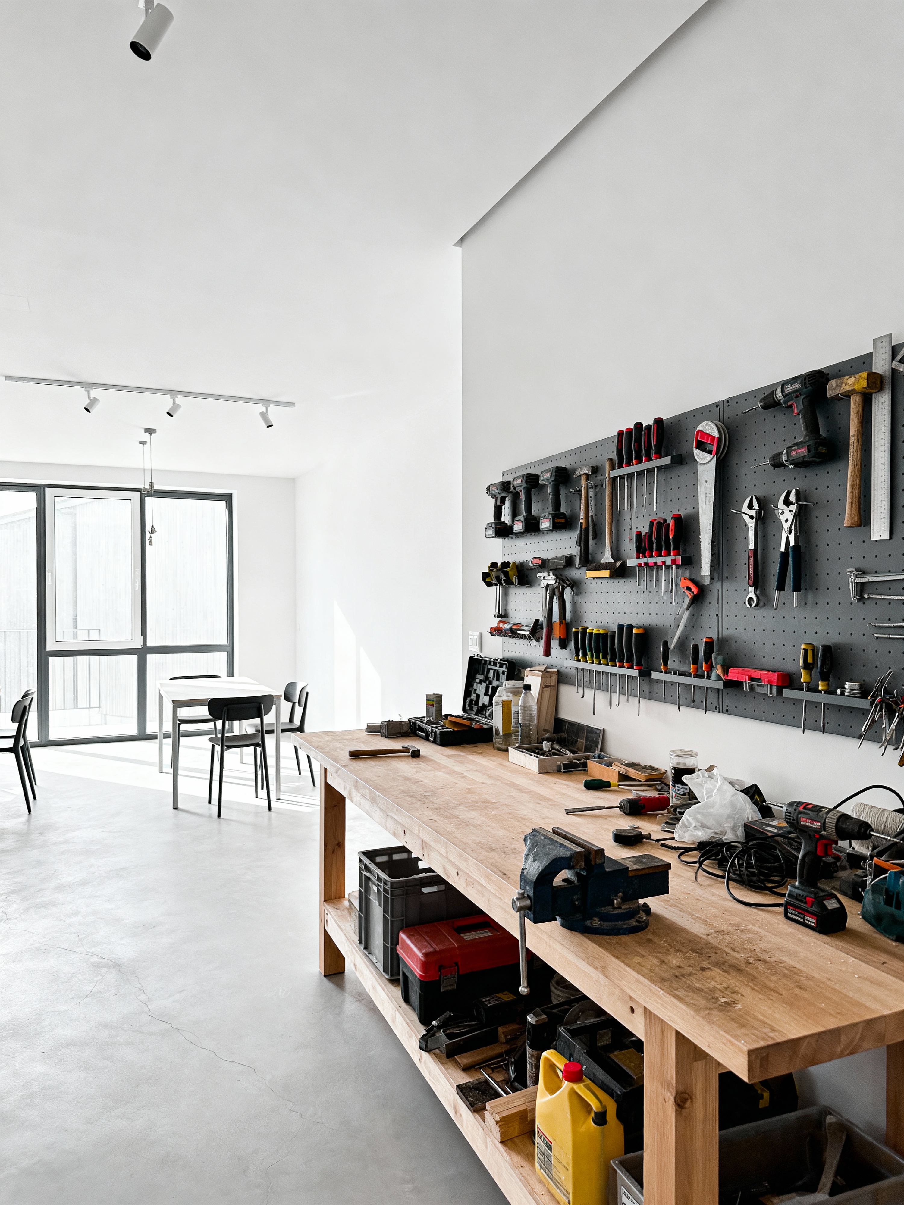 workshop with minimalist style with tool wall and wooden workbench and messy and tool wall. . with focus on the shape, colour and texture of just a few of essential elements and an open floor plan and functional furniture and lots of light and a monochromatic palette with colour used as an accent and clean lines and focus on the shape, colour and texture of just a few of essential elements