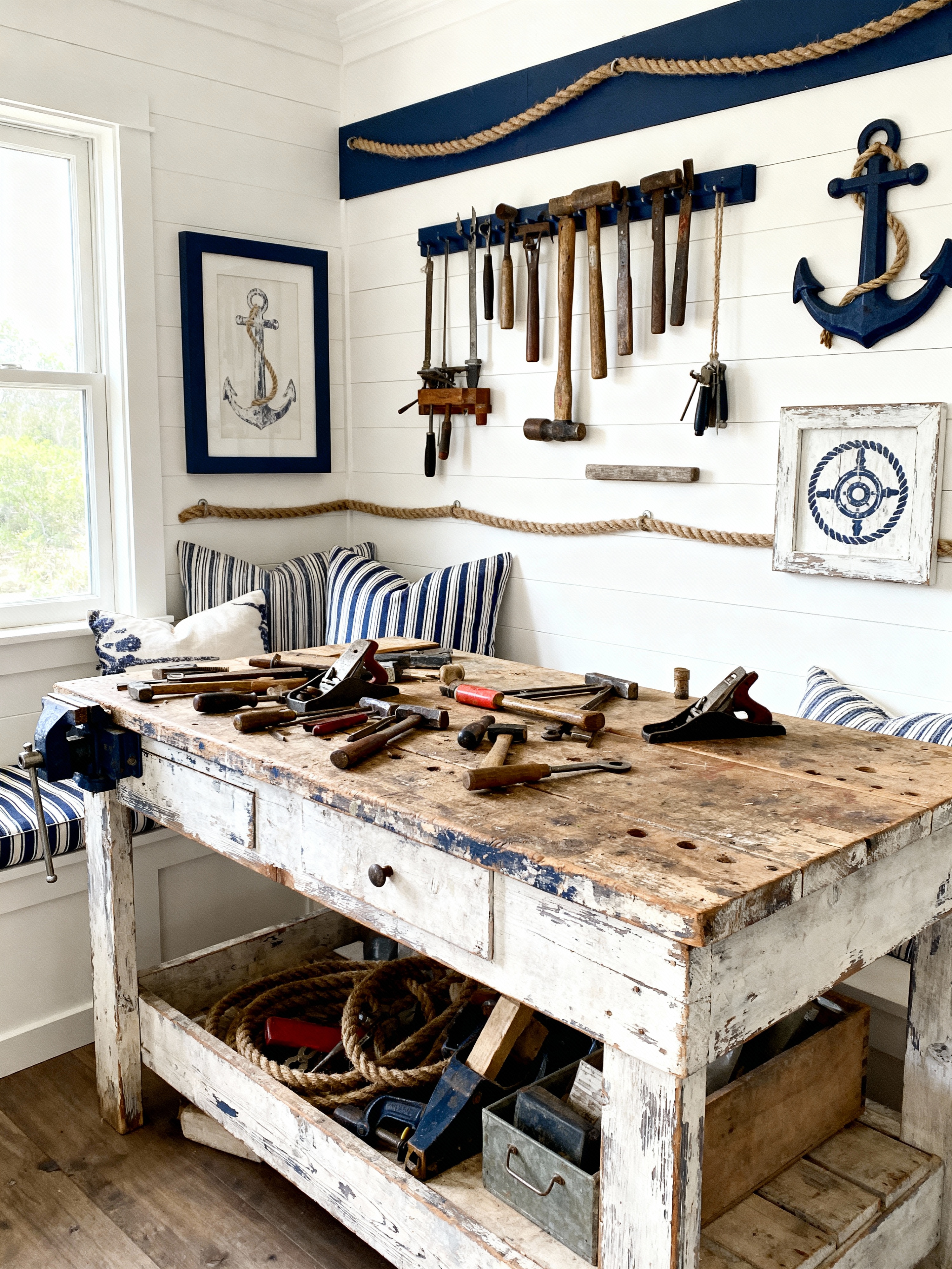workshop with nautical style with tool wall and messy and wooden workbench and tool wall. . with ocean inspiration and rope details and anchor motifs and striped patterns and crisp white and navy blue and coastal vibes and weathered wood