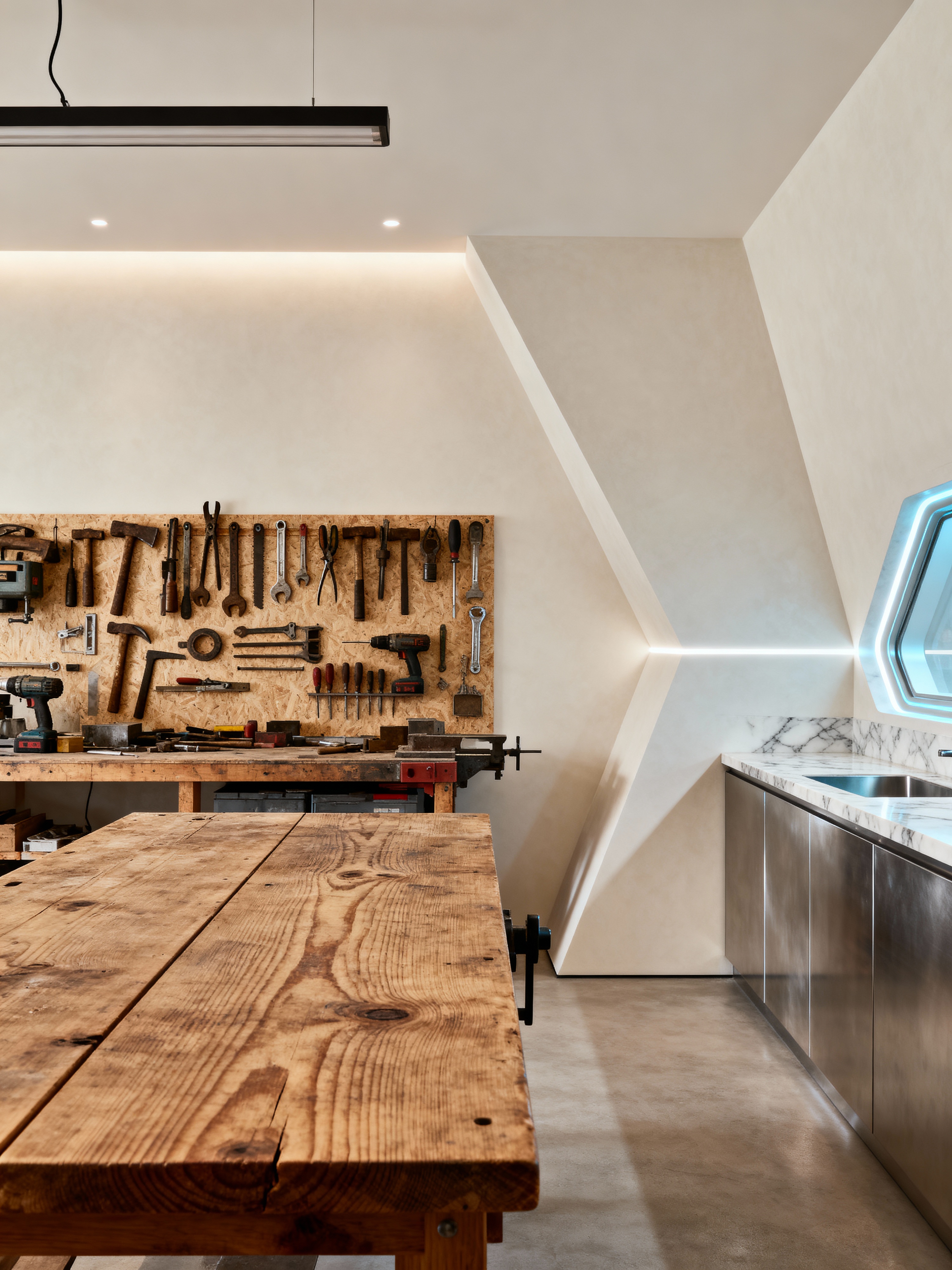 workshop with retro futuristic style with messy and tool wall and wooden workbench and messy. . with smooth marble and steel finishing and futuristic interior and light colors and vintage futurism and minimalist clean lines and strong geometric walls and futurism minimalist interior