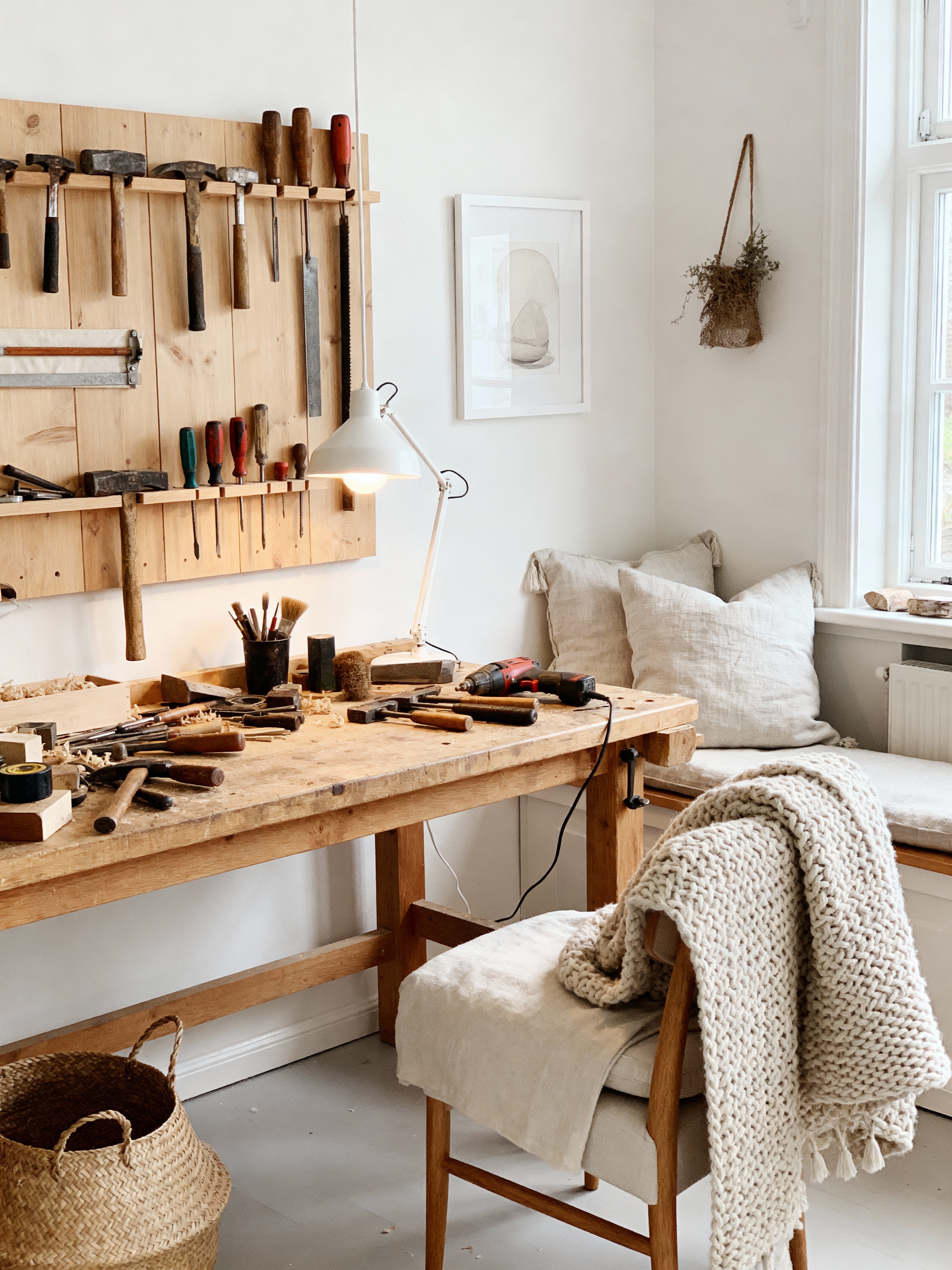 workshop with scandinavian style with messy and wooden workbench and tool wall and messy. . with functional furniture and white decor and hygge and textured fabrics and light wood and natural light and cozy atmosphere and simple elegance