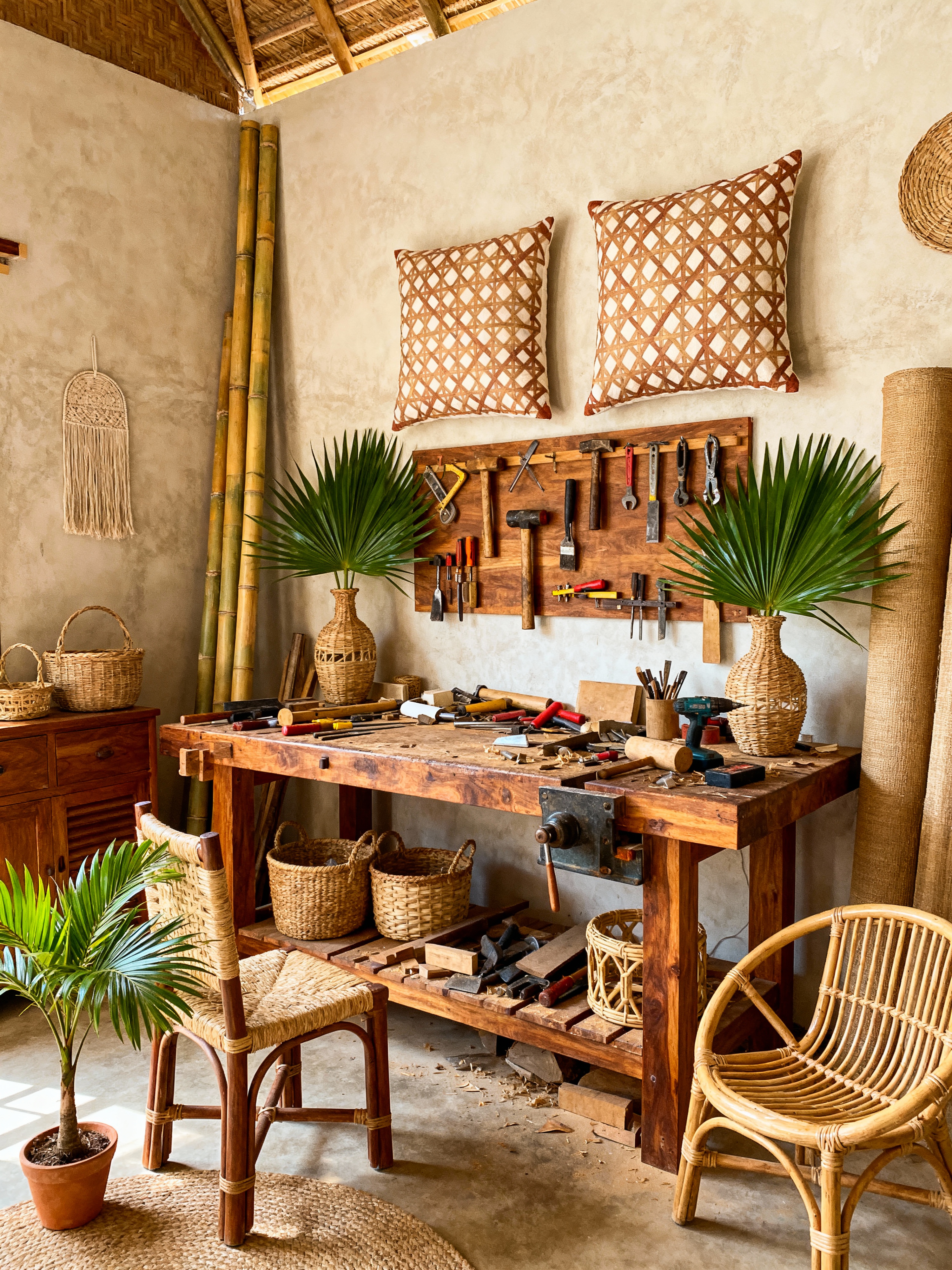 workshop with tropical style with messy and wooden workbench and tool wall and messy. . with lattice prints and wicker and teak and cane motifs and palm leaves and rattan and bamboo and palm trees