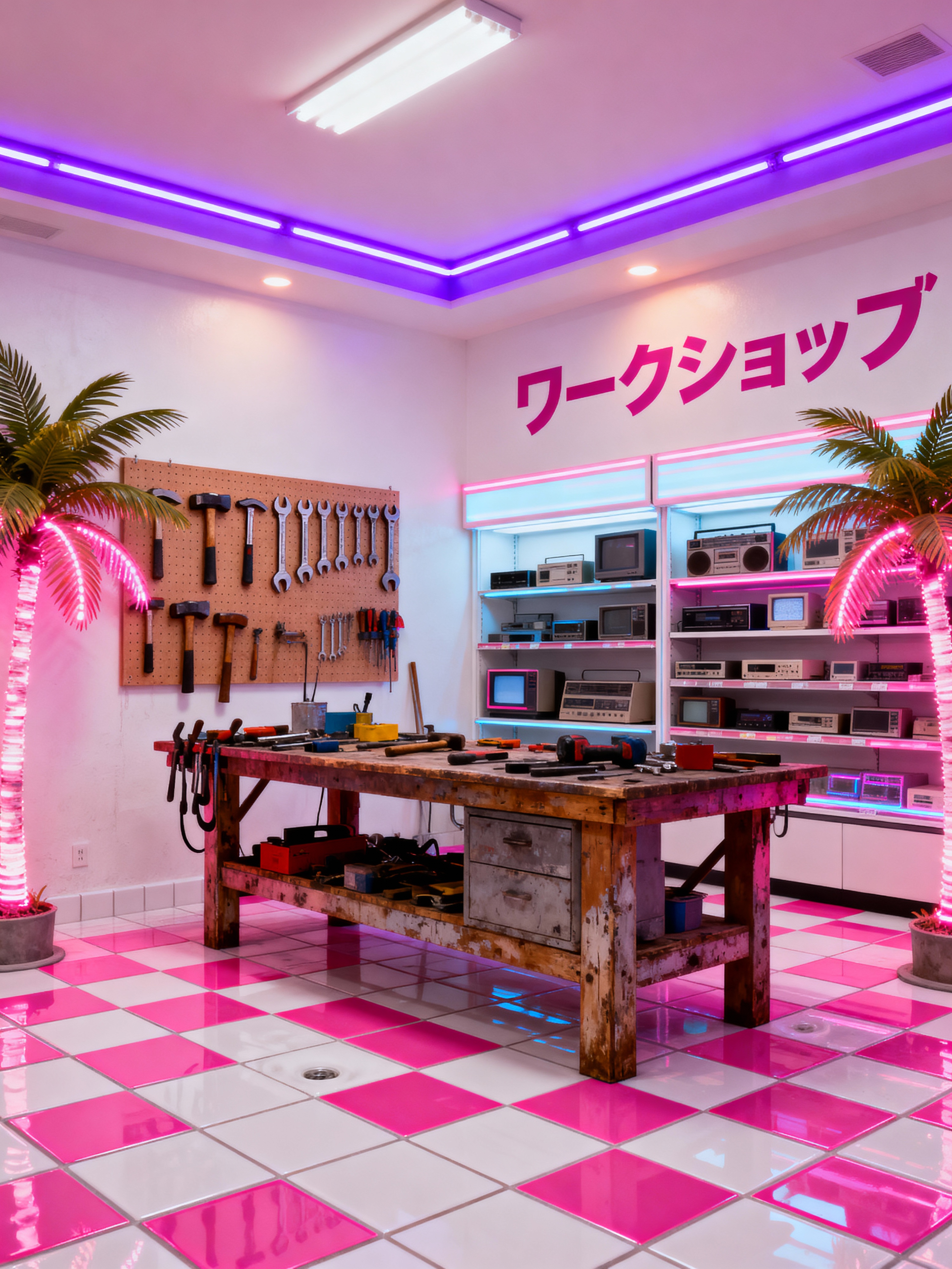 workshop with vaporwave style with wooden workbench and tool wall and messy and wooden workbench. . with palm trees and 1980s retail shops and bright pink and white square bath tiles and purple lights and palm trees and japanese letters on wall and white square bath tiles