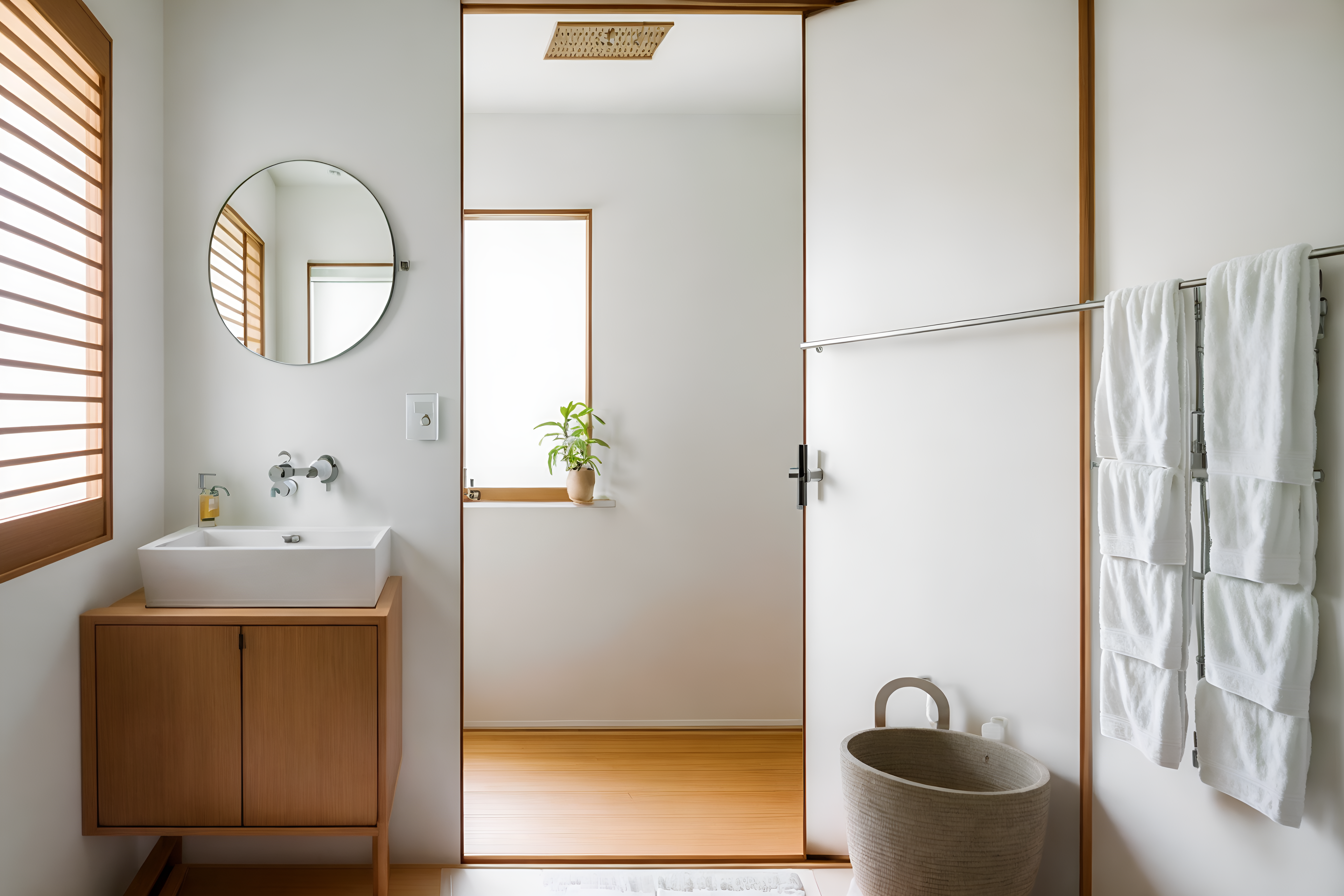 photo from pinterest of zen-style interior designed (bathroom interior) with bath rail and shower and bathroom cabinet and plant and bath towel and waste basket and mirror and bathroom sink with faucet. . with asian zen interior and simple furniture and simplicity and serenity and harmony and asian zen interior and japanese minimalist interior and clutter free and japanese minimalist interior. . cinematic photo, highly detailed, cinematic lighting, ultra-detailed, ultrarealistic, photorealism, 8k. trending on pinterest. zen interior design style. masterpiece, cinematic light, ultrarealistic+, photorealistic+, 8k, raw photo, realistic, sharp focus on eyes, (symmetrical eyes), (intact eyes), hyperrealistic, highest quality, best quality, , highly detailed, masterpiece, best quality, extremely detailed 8k wallpaper, masterpiece, best quality, ultra-detailed, best shadow, detailed background, detailed face, detailed eyes, high contrast, best illumination, detailed face, dulux, caustic, dynamic angle, detailed glow. dramatic lighting. highly detailed, insanely detailed hair, symmetrical, intricate details, professionally retouched, 8k high definition. strong bokeh. award winning photo.