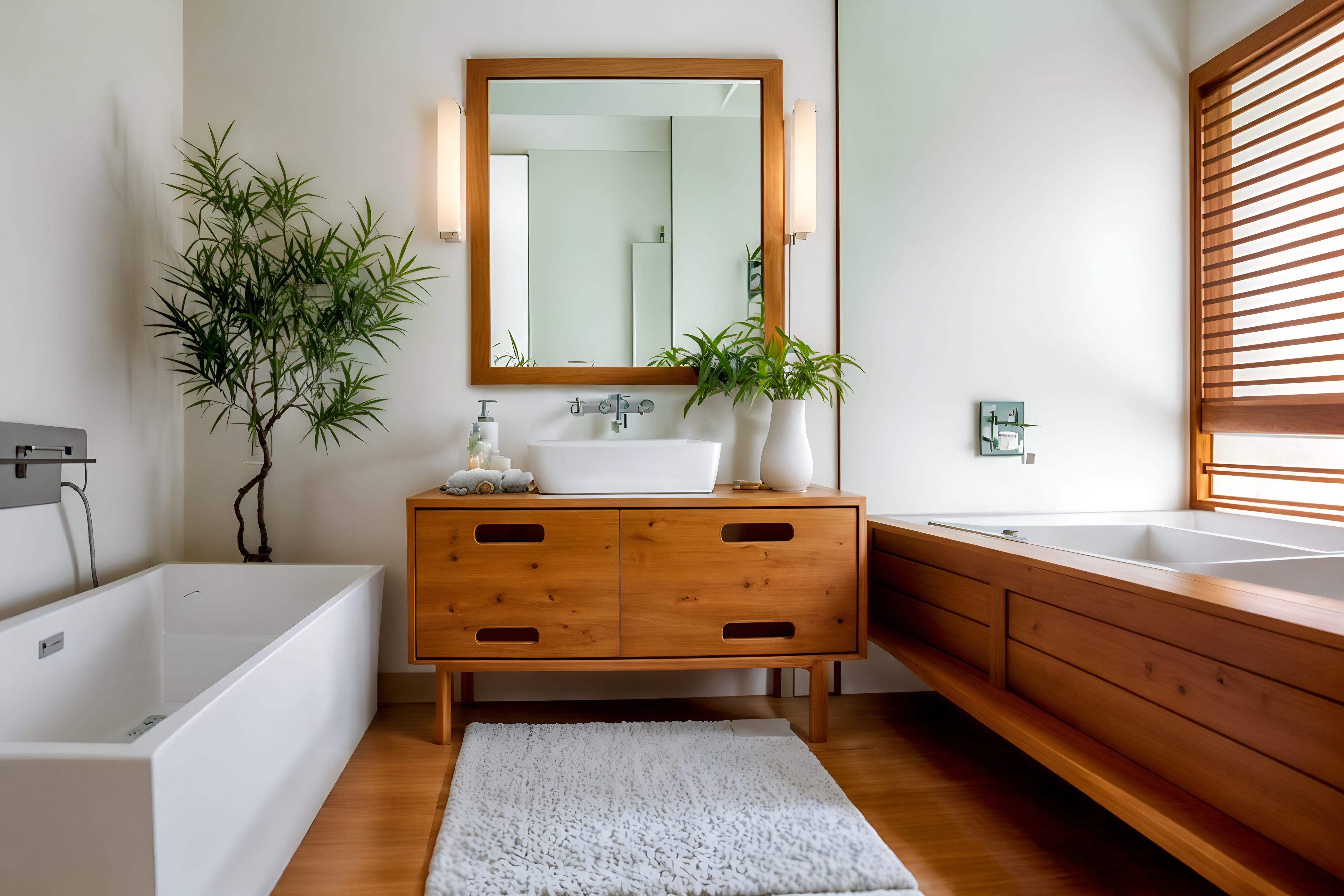 photo from pinterest of zen-style interior designed (bathroom interior) with bath rail and shower and bathroom cabinet and plant and bath towel and waste basket and mirror and bathroom sink with faucet. . with asian zen interior and simple furniture and simplicity and serenity and harmony and asian zen interior and japanese minimalist interior and clutter free and japanese minimalist interior. . cinematic photo, highly detailed, cinematic lighting, ultra-detailed, ultrarealistic, photorealism, 8k. trending on pinterest. zen interior design style. masterpiece, cinematic light, ultrarealistic+, photorealistic+, 8k, raw photo, realistic, sharp focus on eyes, (symmetrical eyes), (intact eyes), hyperrealistic, highest quality, best quality, , highly detailed, masterpiece, best quality, extremely detailed 8k wallpaper, masterpiece, best quality, ultra-detailed, best shadow, detailed background, detailed face, detailed eyes, high contrast, best illumination, detailed face, dulux, caustic, dynamic angle, detailed glow. dramatic lighting. highly detailed, insanely detailed hair, symmetrical, intricate details, professionally retouched, 8k high definition. strong bokeh. award winning photo.