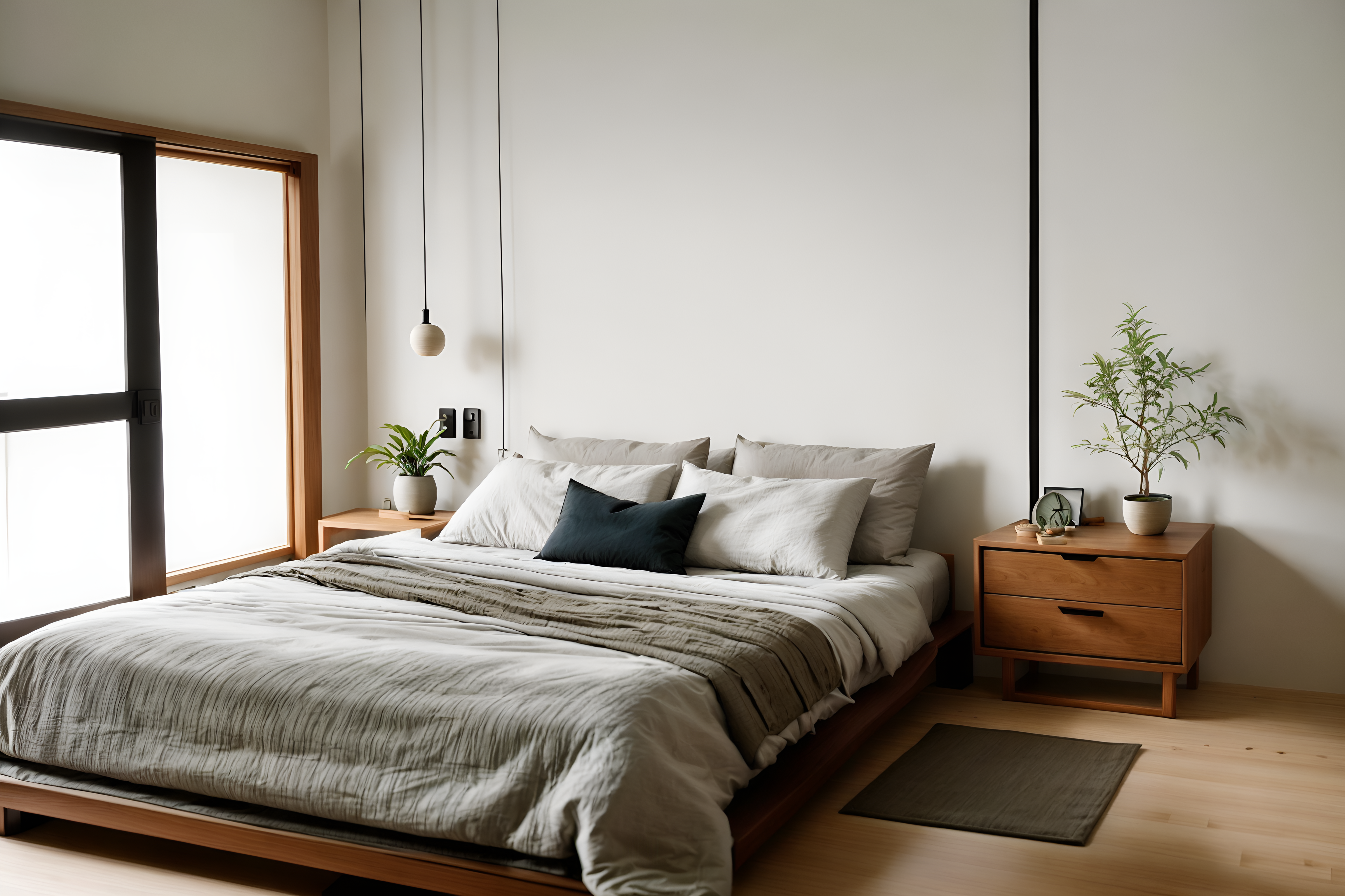 photo from pinterest of zen-style interior designed (bedroom interior) with accent chair and dresser closet and bedside table or night stand and bed and plant and storage bench or ottoman and headboard and mirror. . with asian interior and natural light and japanese minimalist interior and japanese minimalist interior and mimimalist and japanese interior and simplicity and calm and neutral colors. . cinematic photo, highly detailed, cinematic lighting, ultra-detailed, ultrarealistic, photorealism, 8k. trending on pinterest. zen interior design style. masterpiece, cinematic light, ultrarealistic+, photorealistic+, 8k, raw photo, realistic, sharp focus on eyes, (symmetrical eyes), (intact eyes), hyperrealistic, highest quality, best quality, , highly detailed, masterpiece, best quality, extremely detailed 8k wallpaper, masterpiece, best quality, ultra-detailed, best shadow, detailed background, detailed face, detailed eyes, high contrast, best illumination, detailed face, dulux, caustic, dynamic angle, detailed glow. dramatic lighting. highly detailed, insanely detailed hair, symmetrical, intricate details, professionally retouched, 8k high definition. strong bokeh. award winning photo.