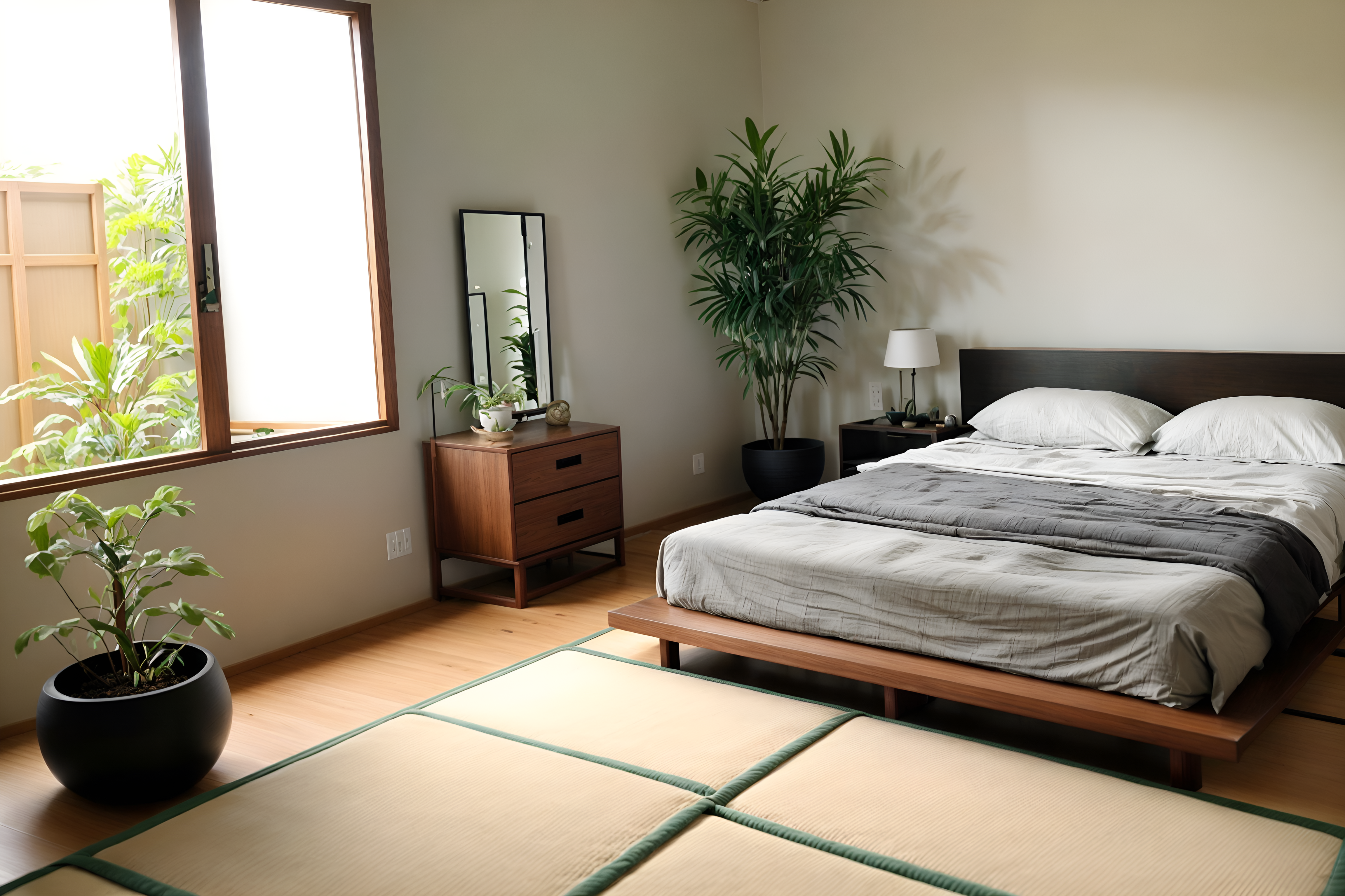 photo from pinterest of zen-style interior designed (bedroom interior) with accent chair and dresser closet and bedside table or night stand and bed and plant and storage bench or ottoman and headboard and mirror. . with asian interior and natural light and japanese minimalist interior and japanese minimalist interior and mimimalist and japanese interior and simplicity and calm and neutral colors. . cinematic photo, highly detailed, cinematic lighting, ultra-detailed, ultrarealistic, photorealism, 8k. trending on pinterest. zen interior design style. masterpiece, cinematic light, ultrarealistic+, photorealistic+, 8k, raw photo, realistic, sharp focus on eyes, (symmetrical eyes), (intact eyes), hyperrealistic, highest quality, best quality, , highly detailed, masterpiece, best quality, extremely detailed 8k wallpaper, masterpiece, best quality, ultra-detailed, best shadow, detailed background, detailed face, detailed eyes, high contrast, best illumination, detailed face, dulux, caustic, dynamic angle, detailed glow. dramatic lighting. highly detailed, insanely detailed hair, symmetrical, intricate details, professionally retouched, 8k high definition. strong bokeh. award winning photo.