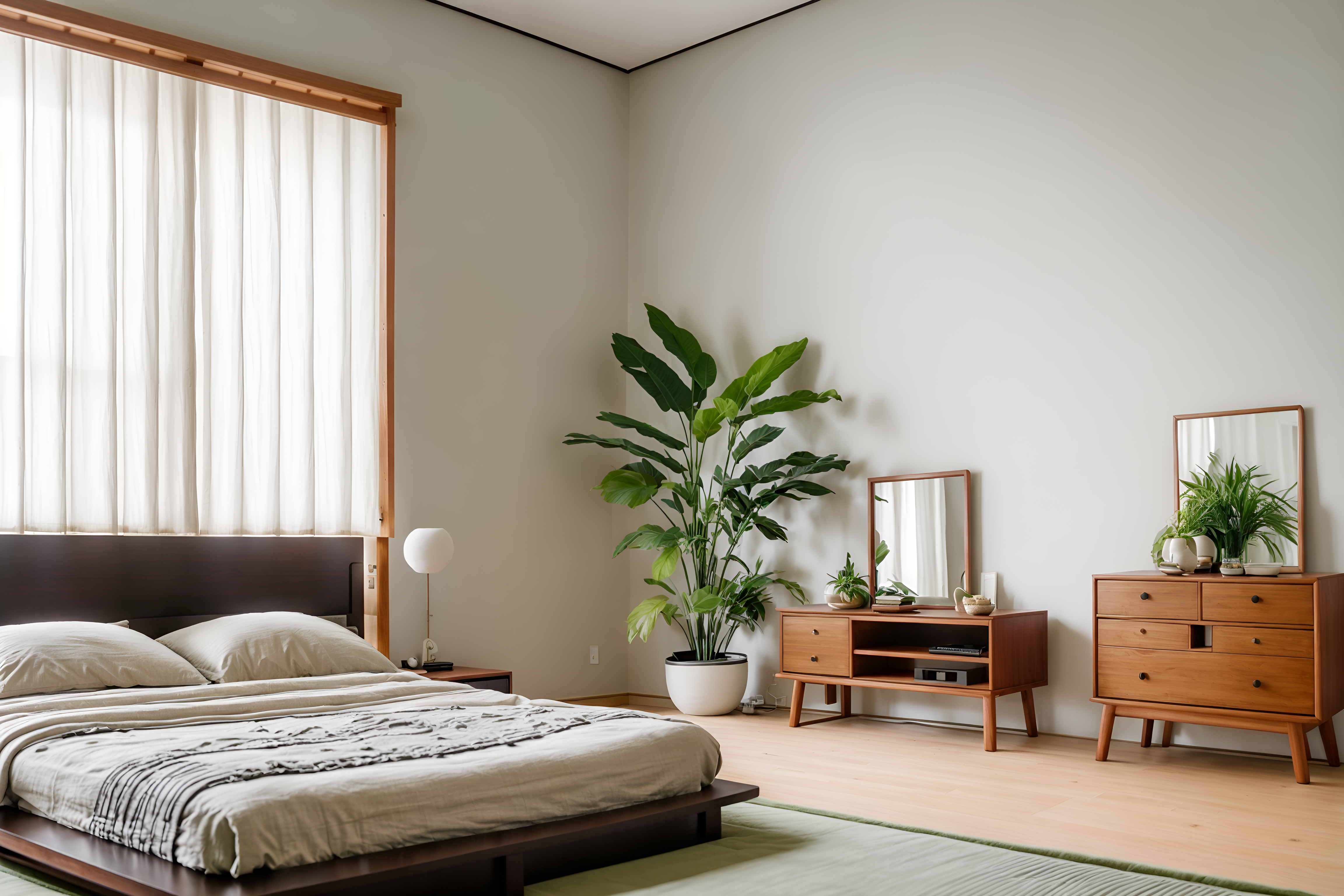 photo from pinterest of zen-style interior designed (bedroom interior) with accent chair and dresser closet and bedside table or night stand and bed and plant and storage bench or ottoman and headboard and mirror. . with asian interior and natural light and japanese minimalist interior and japanese minimalist interior and mimimalist and japanese interior and simplicity and calm and neutral colors. . cinematic photo, highly detailed, cinematic lighting, ultra-detailed, ultrarealistic, photorealism, 8k. trending on pinterest. zen interior design style. masterpiece, cinematic light, ultrarealistic+, photorealistic+, 8k, raw photo, realistic, sharp focus on eyes, (symmetrical eyes), (intact eyes), hyperrealistic, highest quality, best quality, , highly detailed, masterpiece, best quality, extremely detailed 8k wallpaper, masterpiece, best quality, ultra-detailed, best shadow, detailed background, detailed face, detailed eyes, high contrast, best illumination, detailed face, dulux, caustic, dynamic angle, detailed glow. dramatic lighting. highly detailed, insanely detailed hair, symmetrical, intricate details, professionally retouched, 8k high definition. strong bokeh. award winning photo.