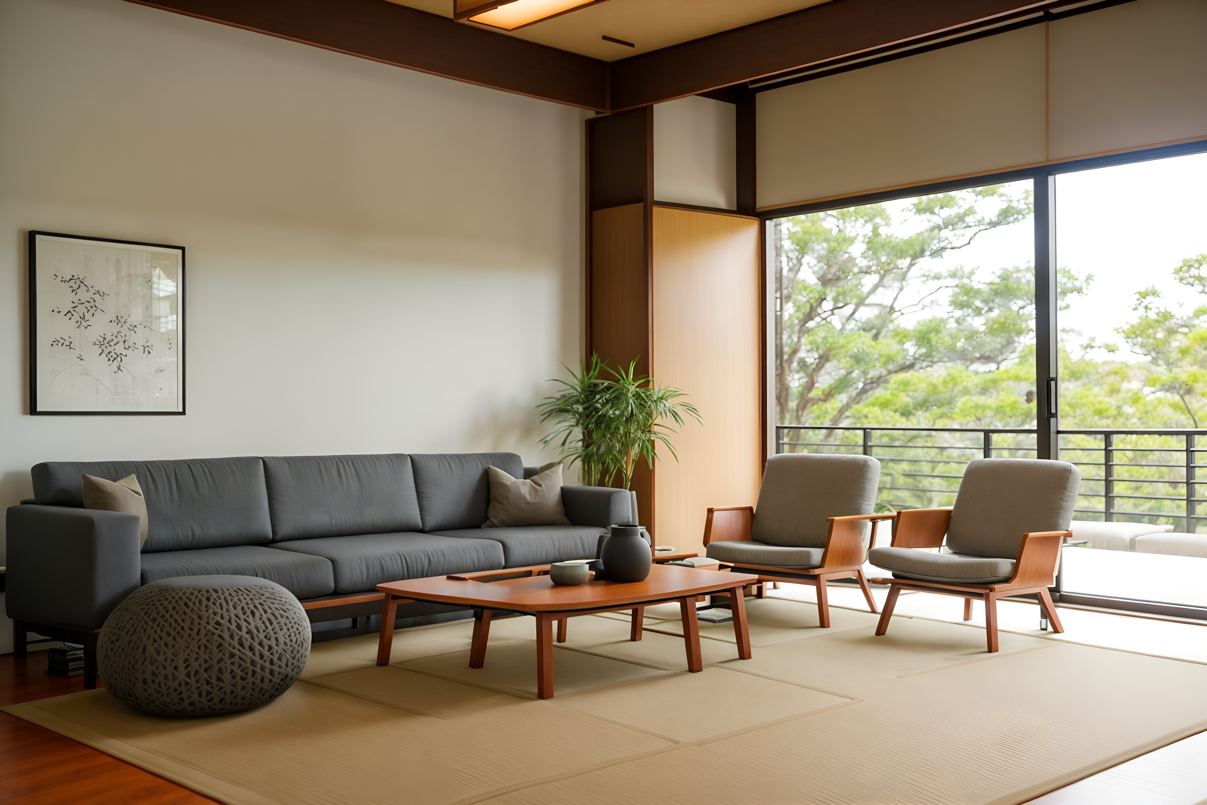 zen coworking spacesinterior decorate this coworking space with zen style. . . with office desks and seating area with sofa and office chairs and lounge chairs and office desks. . with natural textures and asian interior and clutter free and mimimalist and japanese minimalist interior and serenity and harmony and japanese minimalist interior and calm and neutral colors. . .