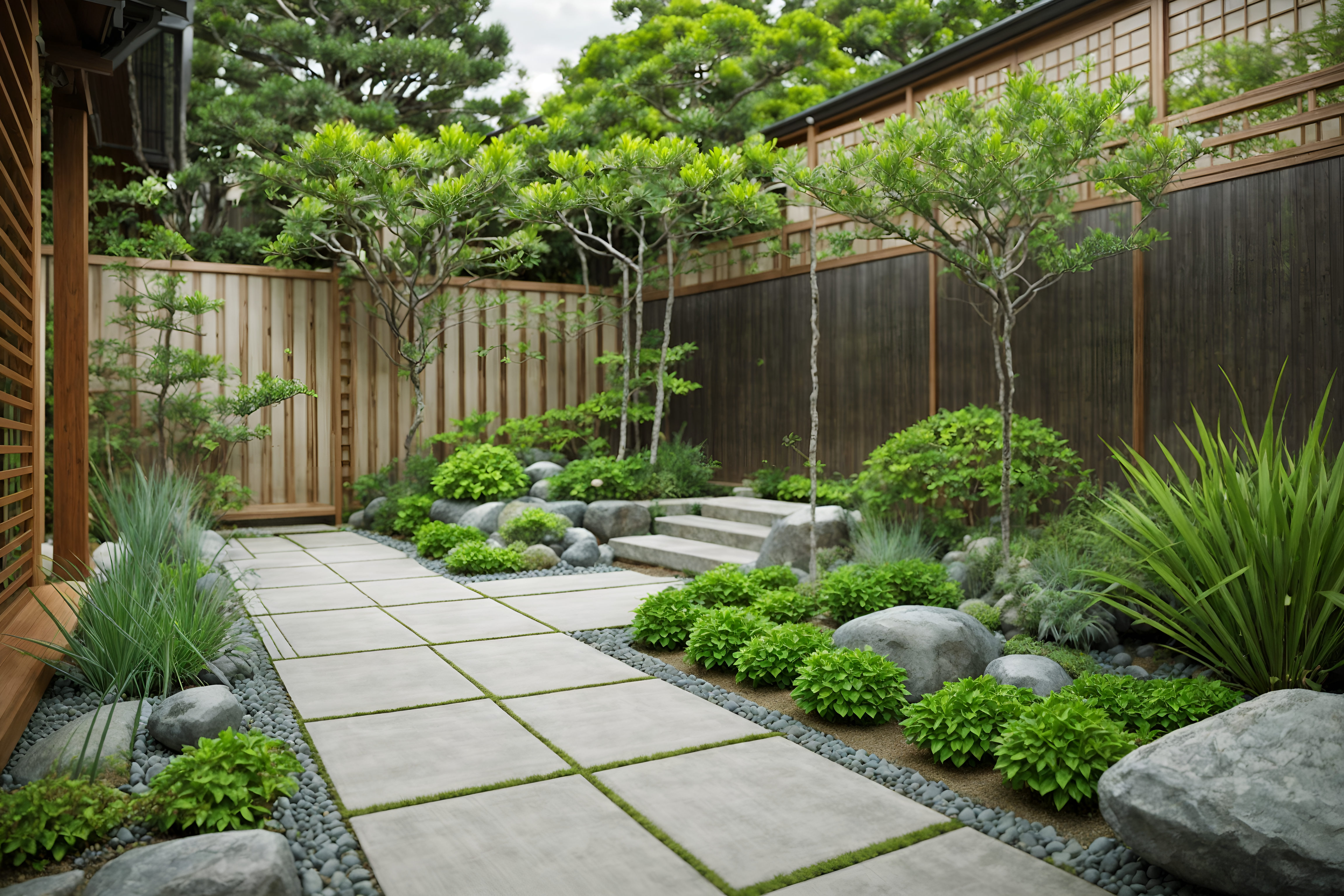 zen outdoor gardensinterior decorate this outdoor garden with zen style. . . with garden tree and garden plants and grass and garden tree. . with japanese minimalist and serenity and harmony and mimimalist and calm and neutral colors and japanese minimalist and japanese and asian zen and simple furniture. . .