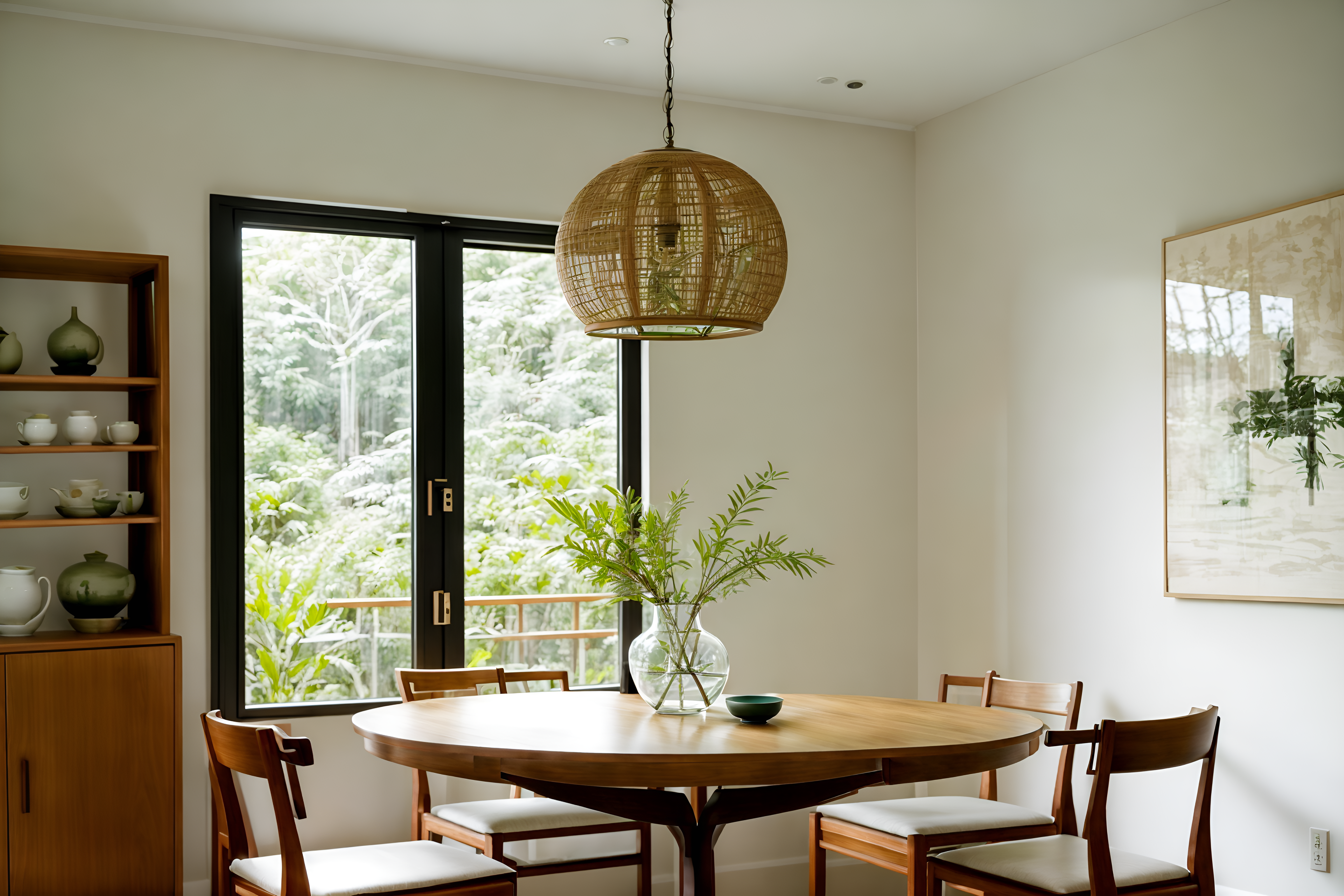 photo from pinterest of zen-style interior designed (dining room interior) with vase and dining table and plant and plates, cutlery and glasses on dining table and dining table chairs and painting or photo on wall and light or chandelier and bookshelves. . with serenity and harmony and natural light and natural textures and simplicity and asian interior and simple furniture and calm and neutral colors and japanese minimalist interior. . cinematic photo, highly detailed, cinematic lighting, ultra-detailed, ultrarealistic, photorealism, 8k. trending on pinterest. zen interior design style. masterpiece, cinematic light, ultrarealistic+, photorealistic+, 8k, raw photo, realistic, sharp focus on eyes, (symmetrical eyes), (intact eyes), hyperrealistic, highest quality, best quality, , highly detailed, masterpiece, best quality, extremely detailed 8k wallpaper, masterpiece, best quality, ultra-detailed, best shadow, detailed background, detailed face, detailed eyes, high contrast, best illumination, detailed face, dulux, caustic, dynamic angle, detailed glow. dramatic lighting. highly detailed, insanely detailed hair, symmetrical, intricate details, professionally retouched, 8k high definition. strong bokeh. award winning photo.