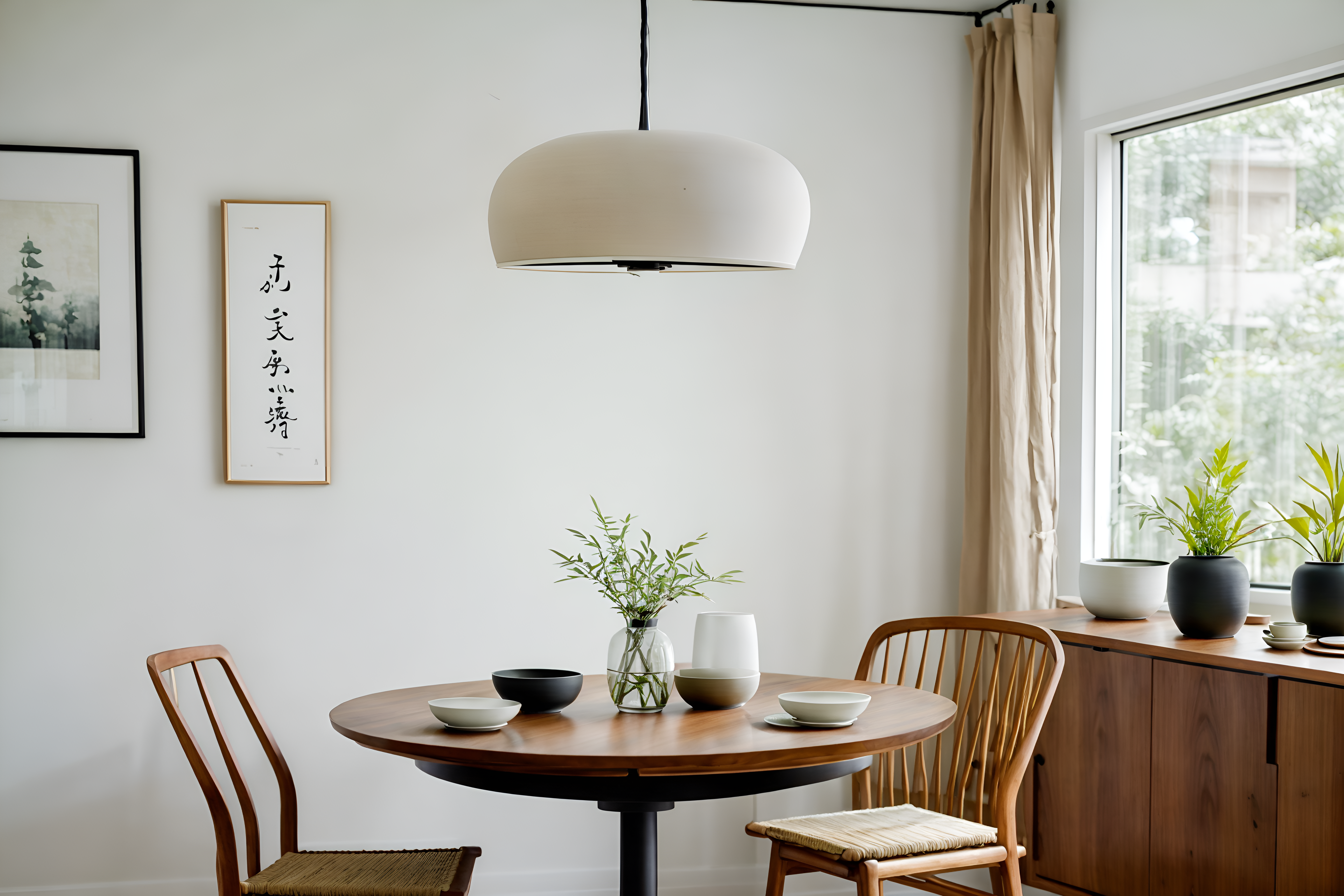 photo from pinterest of zen-style interior designed (dining room interior) with vase and dining table and plant and plates, cutlery and glasses on dining table and dining table chairs and painting or photo on wall and light or chandelier and bookshelves. . with serenity and harmony and natural light and natural textures and simplicity and asian interior and simple furniture and calm and neutral colors and japanese minimalist interior. . cinematic photo, highly detailed, cinematic lighting, ultra-detailed, ultrarealistic, photorealism, 8k. trending on pinterest. zen interior design style. masterpiece, cinematic light, ultrarealistic+, photorealistic+, 8k, raw photo, realistic, sharp focus on eyes, (symmetrical eyes), (intact eyes), hyperrealistic, highest quality, best quality, , highly detailed, masterpiece, best quality, extremely detailed 8k wallpaper, masterpiece, best quality, ultra-detailed, best shadow, detailed background, detailed face, detailed eyes, high contrast, best illumination, detailed face, dulux, caustic, dynamic angle, detailed glow. dramatic lighting. highly detailed, insanely detailed hair, symmetrical, intricate details, professionally retouched, 8k high definition. strong bokeh. award winning photo.