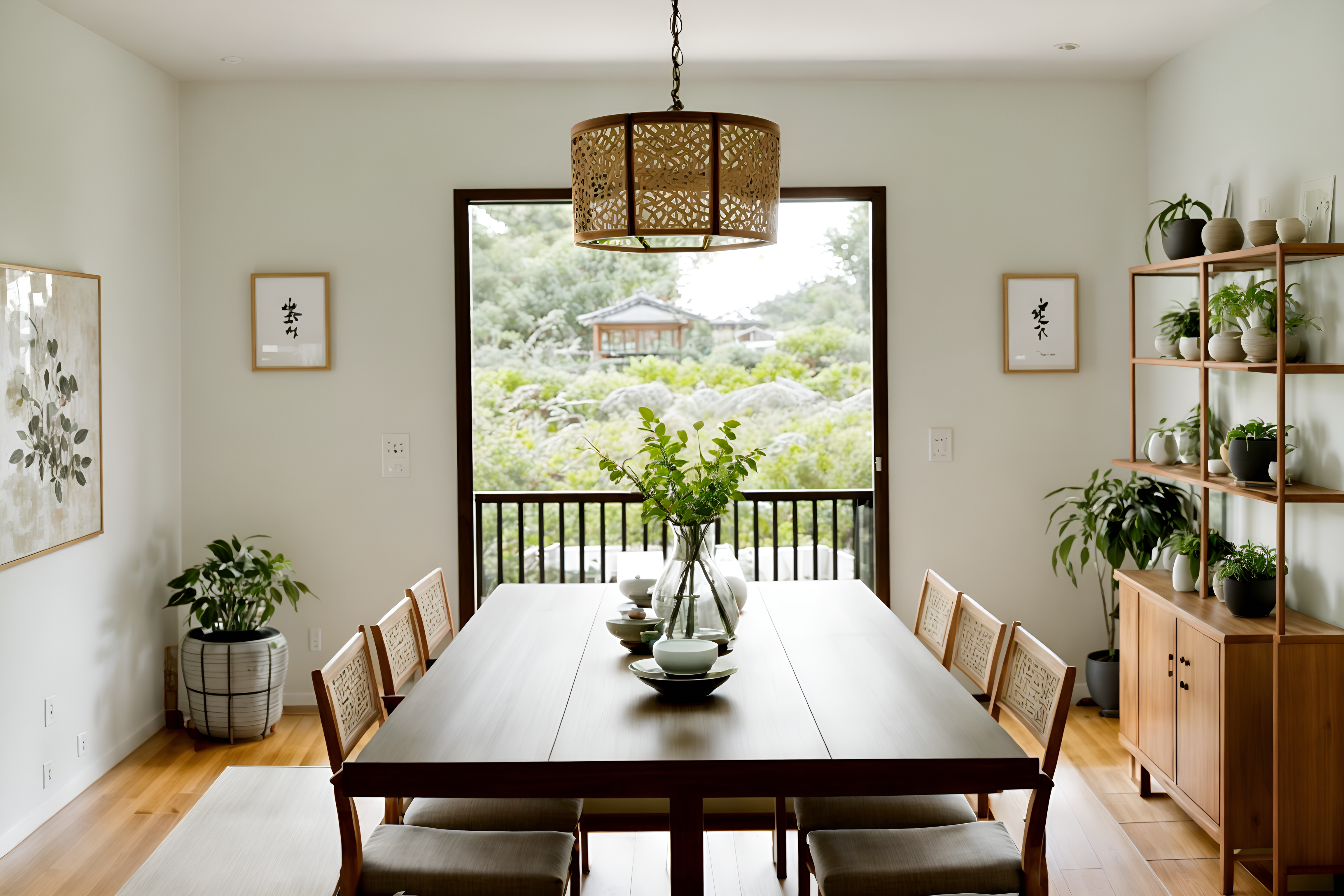 photo from pinterest of zen-style interior designed (dining room interior) with vase and dining table and plant and plates, cutlery and glasses on dining table and dining table chairs and painting or photo on wall and light or chandelier and bookshelves. . with serenity and harmony and natural light and natural textures and simplicity and asian interior and simple furniture and calm and neutral colors and japanese minimalist interior. . cinematic photo, highly detailed, cinematic lighting, ultra-detailed, ultrarealistic, photorealism, 8k. trending on pinterest. zen interior design style. masterpiece, cinematic light, ultrarealistic+, photorealistic+, 8k, raw photo, realistic, sharp focus on eyes, (symmetrical eyes), (intact eyes), hyperrealistic, highest quality, best quality, , highly detailed, masterpiece, best quality, extremely detailed 8k wallpaper, masterpiece, best quality, ultra-detailed, best shadow, detailed background, detailed face, detailed eyes, high contrast, best illumination, detailed face, dulux, caustic, dynamic angle, detailed glow. dramatic lighting. highly detailed, insanely detailed hair, symmetrical, intricate details, professionally retouched, 8k high definition. strong bokeh. award winning photo.
