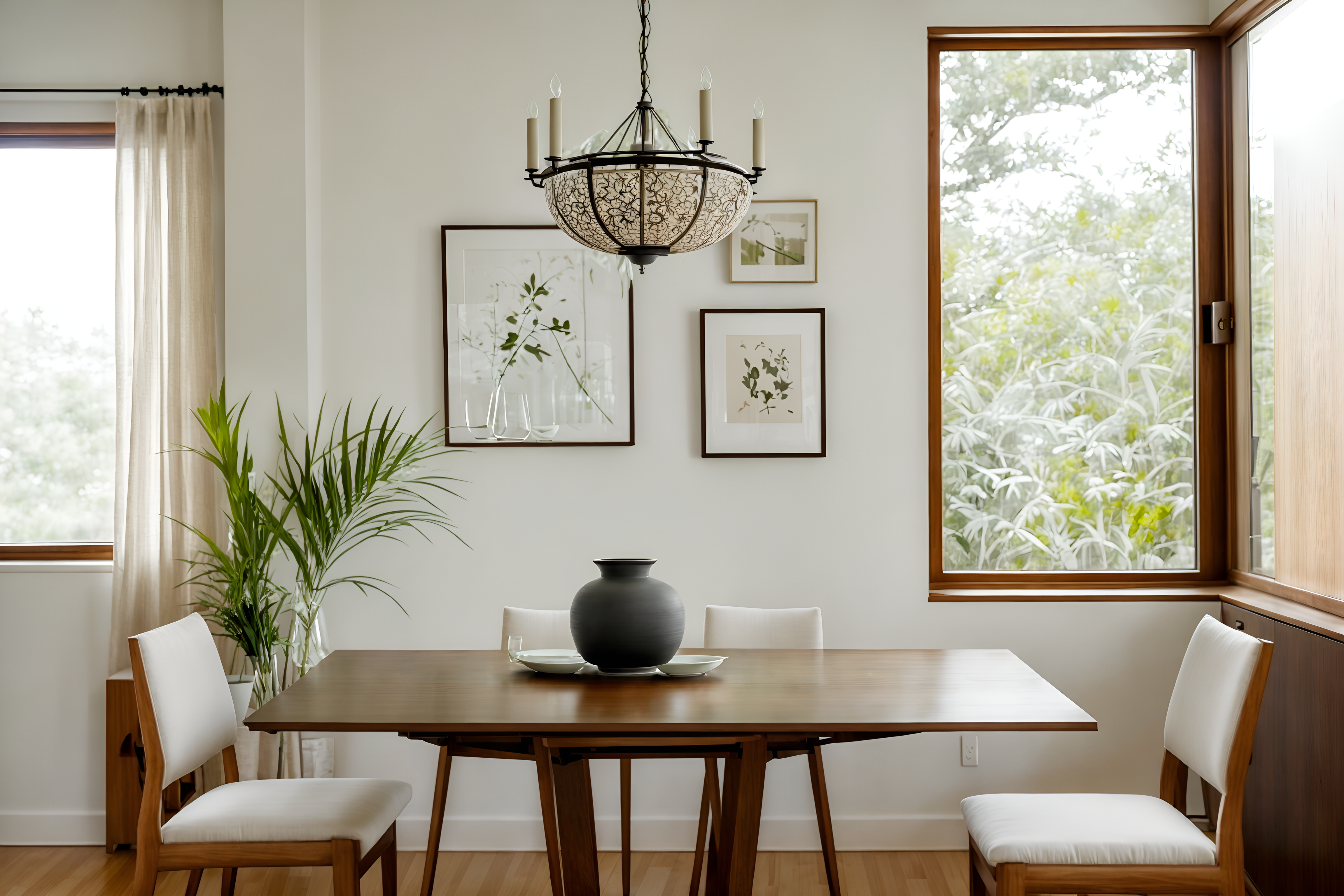 photo from pinterest of zen-style interior designed (dining room interior) with vase and dining table and plant and plates, cutlery and glasses on dining table and dining table chairs and painting or photo on wall and light or chandelier and bookshelves. . with serenity and harmony and natural light and natural textures and simplicity and asian interior and simple furniture and calm and neutral colors and japanese minimalist interior. . cinematic photo, highly detailed, cinematic lighting, ultra-detailed, ultrarealistic, photorealism, 8k. trending on pinterest. zen interior design style. masterpiece, cinematic light, ultrarealistic+, photorealistic+, 8k, raw photo, realistic, sharp focus on eyes, (symmetrical eyes), (intact eyes), hyperrealistic, highest quality, best quality, , highly detailed, masterpiece, best quality, extremely detailed 8k wallpaper, masterpiece, best quality, ultra-detailed, best shadow, detailed background, detailed face, detailed eyes, high contrast, best illumination, detailed face, dulux, caustic, dynamic angle, detailed glow. dramatic lighting. highly detailed, insanely detailed hair, symmetrical, intricate details, professionally retouched, 8k high definition. strong bokeh. award winning photo.