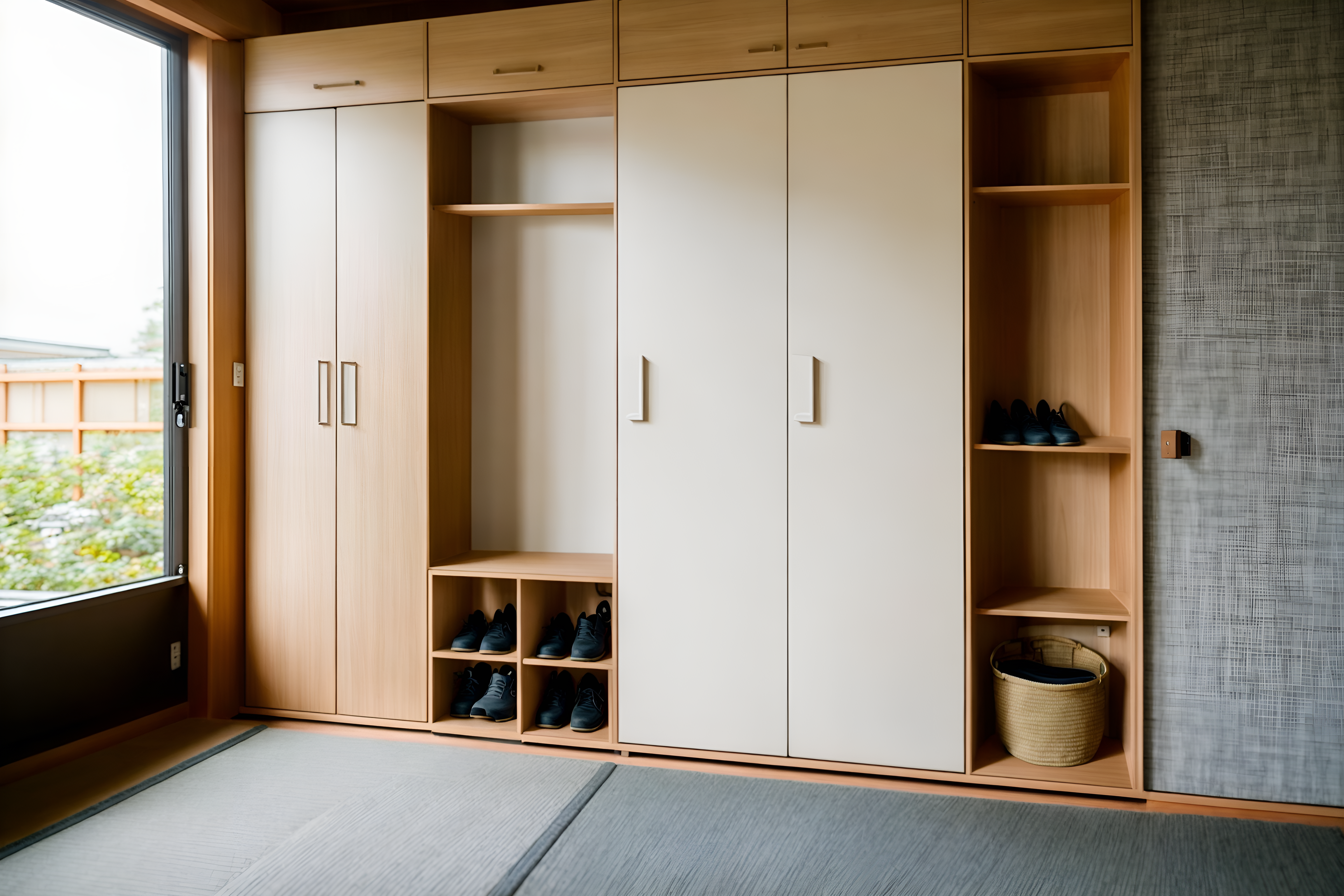 photo from pinterest of zen-style interior designed (drop zone interior) with storage baskets and shelves for shoes and cabinets and lockers and wall hooks for coats and storage drawers and cubbies and high up storage. . with japanese minimalist interior and japanese minimalist interior and simplicity and clean lines and natural light and serenity and harmony and asian zen interior and asian interior. . cinematic photo, highly detailed, cinematic lighting, ultra-detailed, ultrarealistic, photorealism, 8k. trending on pinterest. zen interior design style. masterpiece, cinematic light, ultrarealistic+, photorealistic+, 8k, raw photo, realistic, sharp focus on eyes, (symmetrical eyes), (intact eyes), hyperrealistic, highest quality, best quality, , highly detailed, masterpiece, best quality, extremely detailed 8k wallpaper, masterpiece, best quality, ultra-detailed, best shadow, detailed background, detailed face, detailed eyes, high contrast, best illumination, detailed face, dulux, caustic, dynamic angle, detailed glow. dramatic lighting. highly detailed, insanely detailed hair, symmetrical, intricate details, professionally retouched, 8k high definition. strong bokeh. award winning photo.