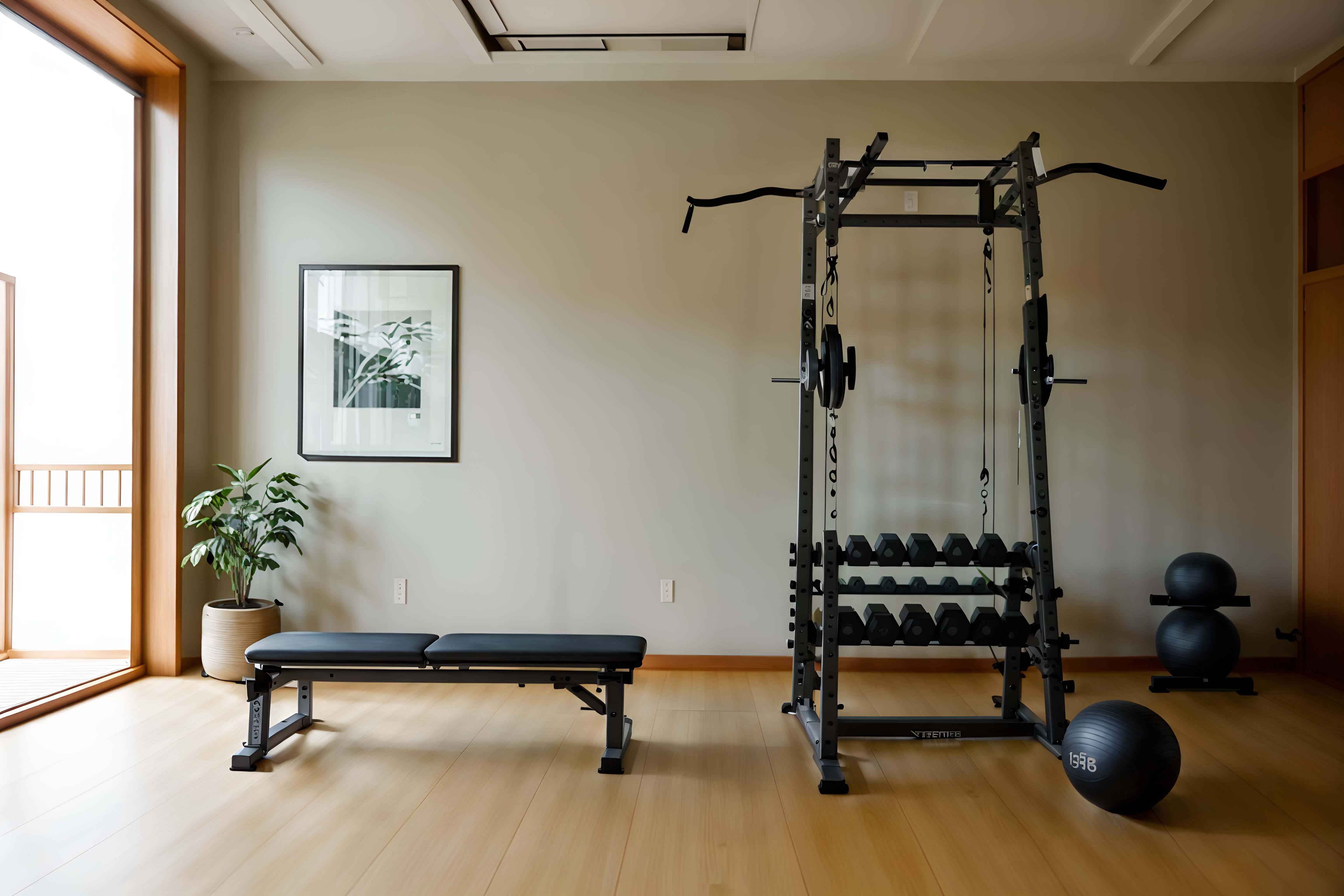 photo from pinterest of zen-style interior designed (fitness gym interior) with crosstrainer and bench press and dumbbell stand and exercise bicycle and squat rack and crosstrainer. . with serenity and harmony and calm and neutral colors and japanese interior and natural light and japanese minimalist interior and simple furniture and asian zen interior and asian interior. . cinematic photo, highly detailed, cinematic lighting, ultra-detailed, ultrarealistic, photorealism, 8k. trending on pinterest. zen interior design style. masterpiece, cinematic light, ultrarealistic+, photorealistic+, 8k, raw photo, realistic, sharp focus on eyes, (symmetrical eyes), (intact eyes), hyperrealistic, highest quality, best quality, , highly detailed, masterpiece, best quality, extremely detailed 8k wallpaper, masterpiece, best quality, ultra-detailed, best shadow, detailed background, detailed face, detailed eyes, high contrast, best illumination, detailed face, dulux, caustic, dynamic angle, detailed glow. dramatic lighting. highly detailed, insanely detailed hair, symmetrical, intricate details, professionally retouched, 8k high definition. strong bokeh. award winning photo.