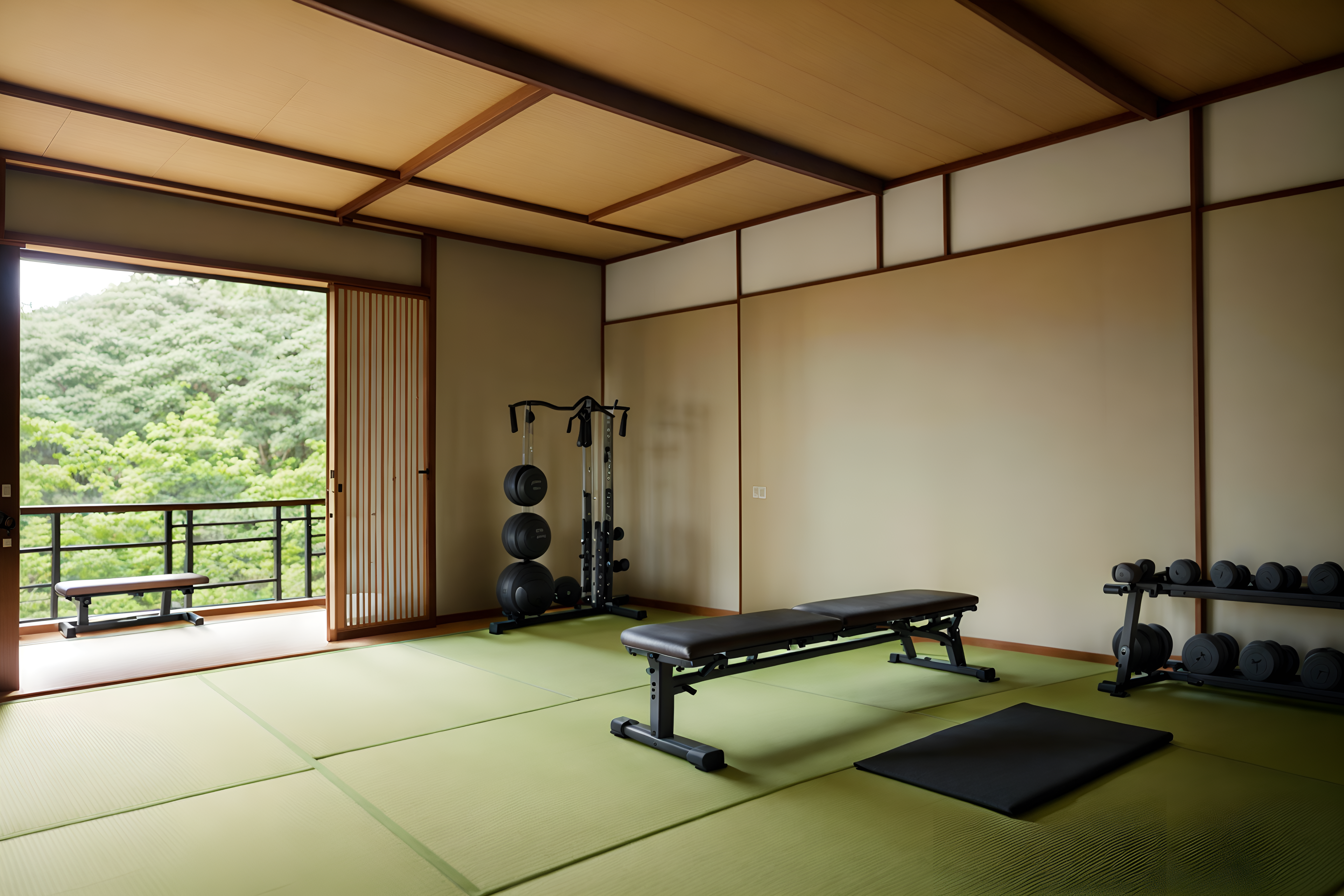 photo from pinterest of zen-style interior designed (fitness gym interior) with crosstrainer and bench press and dumbbell stand and exercise bicycle and squat rack and crosstrainer. . with serenity and harmony and calm and neutral colors and japanese interior and natural light and japanese minimalist interior and simple furniture and asian zen interior and asian interior. . cinematic photo, highly detailed, cinematic lighting, ultra-detailed, ultrarealistic, photorealism, 8k. trending on pinterest. zen interior design style. masterpiece, cinematic light, ultrarealistic+, photorealistic+, 8k, raw photo, realistic, sharp focus on eyes, (symmetrical eyes), (intact eyes), hyperrealistic, highest quality, best quality, , highly detailed, masterpiece, best quality, extremely detailed 8k wallpaper, masterpiece, best quality, ultra-detailed, best shadow, detailed background, detailed face, detailed eyes, high contrast, best illumination, detailed face, dulux, caustic, dynamic angle, detailed glow. dramatic lighting. highly detailed, insanely detailed hair, symmetrical, intricate details, professionally retouched, 8k high definition. strong bokeh. award winning photo.