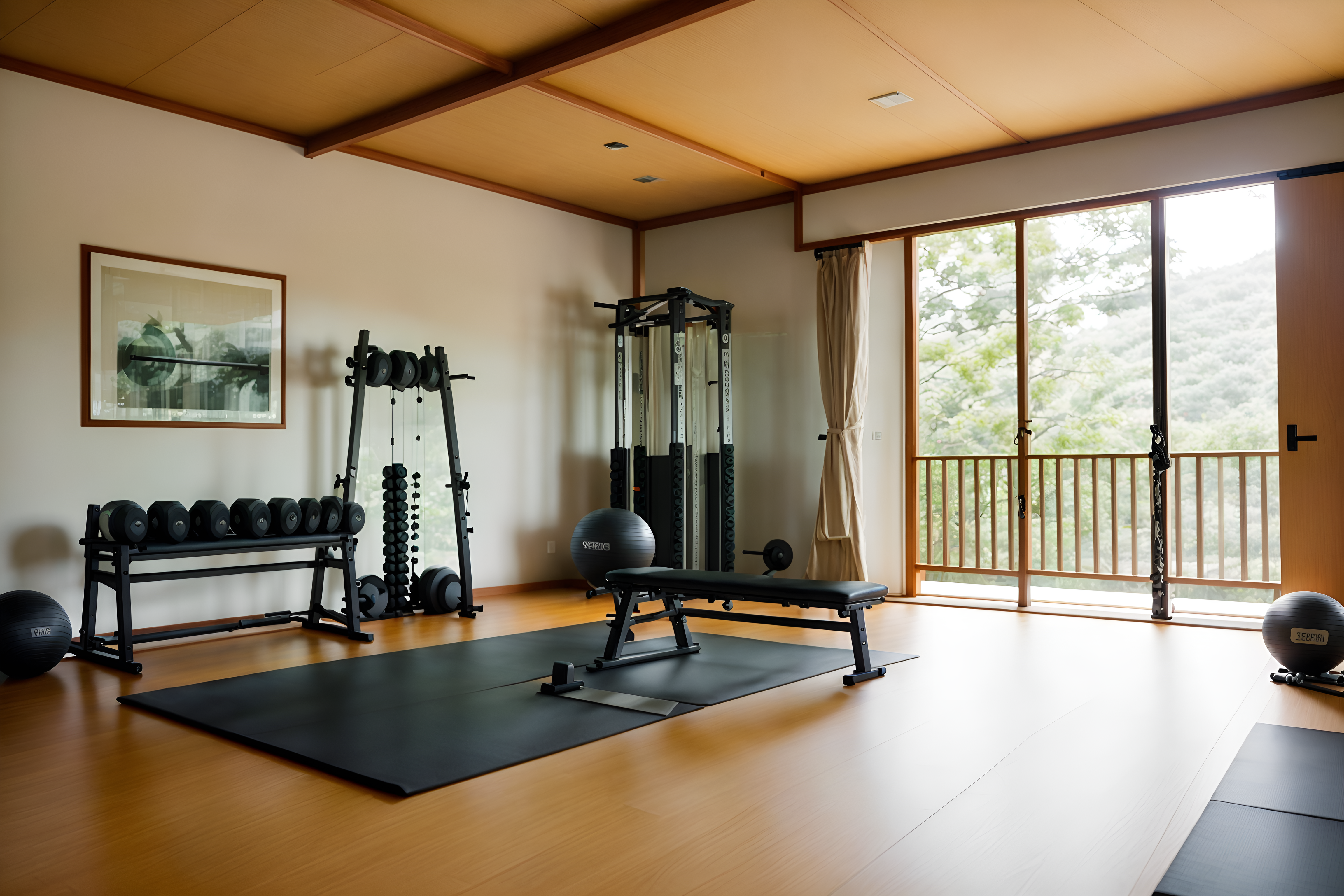 photo from pinterest of zen-style interior designed (fitness gym interior) with crosstrainer and bench press and dumbbell stand and exercise bicycle and squat rack and crosstrainer. . with serenity and harmony and calm and neutral colors and japanese interior and natural light and japanese minimalist interior and simple furniture and asian zen interior and asian interior. . cinematic photo, highly detailed, cinematic lighting, ultra-detailed, ultrarealistic, photorealism, 8k. trending on pinterest. zen interior design style. masterpiece, cinematic light, ultrarealistic+, photorealistic+, 8k, raw photo, realistic, sharp focus on eyes, (symmetrical eyes), (intact eyes), hyperrealistic, highest quality, best quality, , highly detailed, masterpiece, best quality, extremely detailed 8k wallpaper, masterpiece, best quality, ultra-detailed, best shadow, detailed background, detailed face, detailed eyes, high contrast, best illumination, detailed face, dulux, caustic, dynamic angle, detailed glow. dramatic lighting. highly detailed, insanely detailed hair, symmetrical, intricate details, professionally retouched, 8k high definition. strong bokeh. award winning photo.
