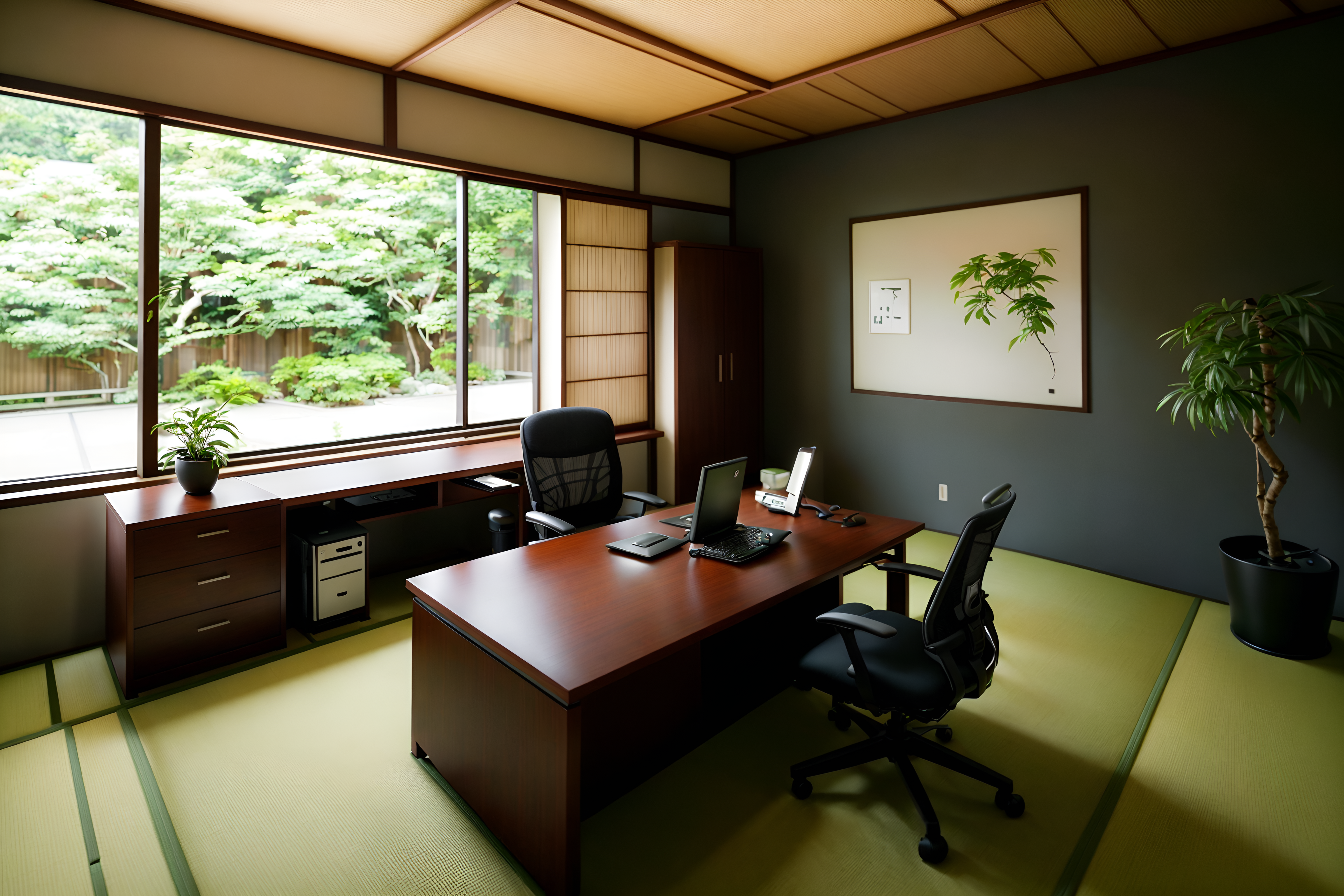 zen home officesinterior decorate this home office with zen style. . . with cabinets and computer desk and plant and office chair and desk lamp and cabinets. . with japanese interior and simple furniture and asian zen interior and serenity and harmony and natural textures and clean lines and asian interior and natural light. . .