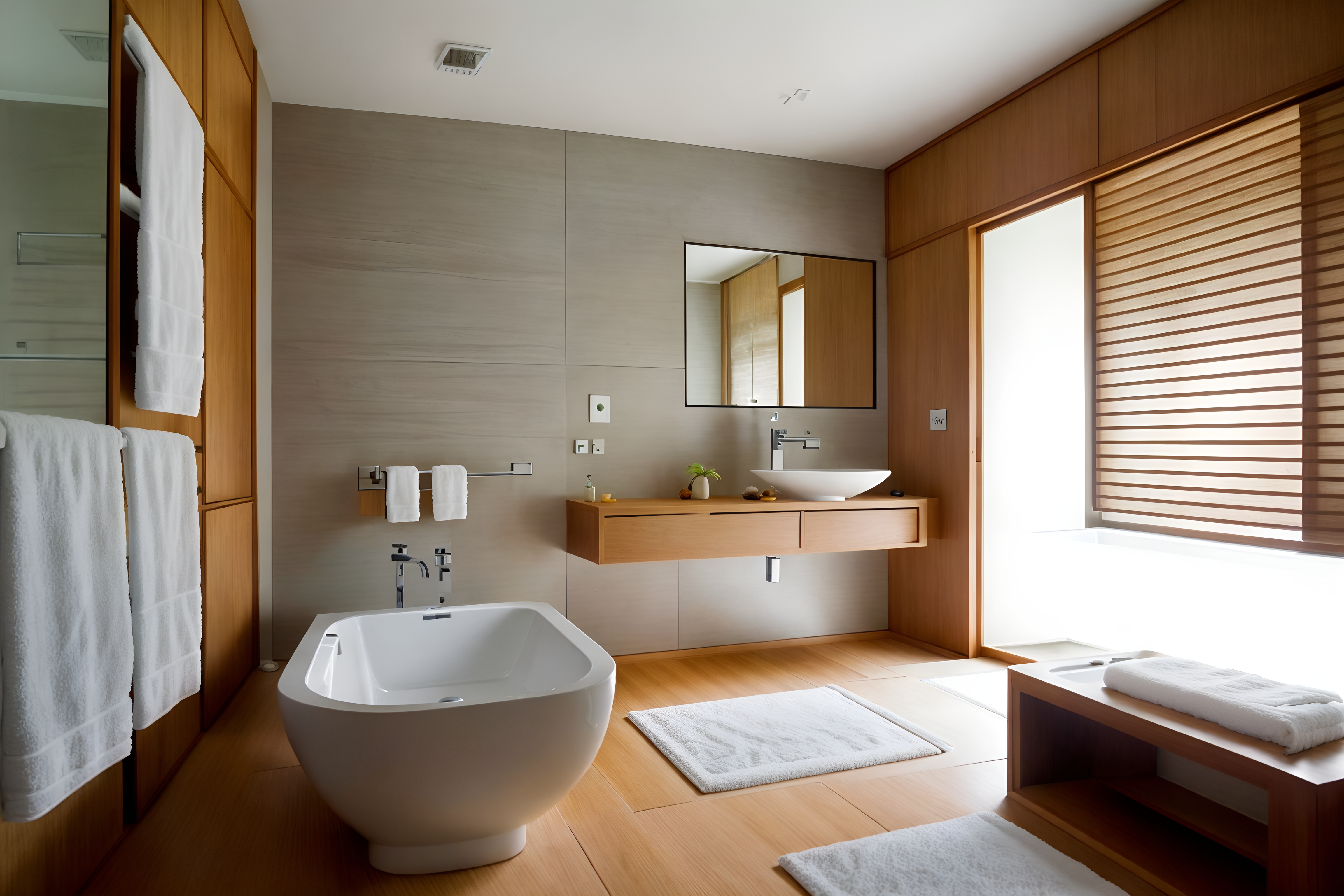 photo from pinterest of zen-style interior designed (hotel bathroom interior) with toilet seat and bath towel and mirror and bathroom cabinet and bathtub and bathroom sink with faucet and waste basket and shower. . with simplicity and serenity and harmony and simple furniture and natural textures and clean lines and japanese minimalist interior and mimimalist and asian zen interior. . cinematic photo, highly detailed, cinematic lighting, ultra-detailed, ultrarealistic, photorealism, 8k. trending on pinterest. zen interior design style. masterpiece, cinematic light, ultrarealistic+, photorealistic+, 8k, raw photo, realistic, sharp focus on eyes, (symmetrical eyes), (intact eyes), hyperrealistic, highest quality, best quality, , highly detailed, masterpiece, best quality, extremely detailed 8k wallpaper, masterpiece, best quality, ultra-detailed, best shadow, detailed background, detailed face, detailed eyes, high contrast, best illumination, detailed face, dulux, caustic, dynamic angle, detailed glow. dramatic lighting. highly detailed, insanely detailed hair, symmetrical, intricate details, professionally retouched, 8k high definition. strong bokeh. award winning photo.