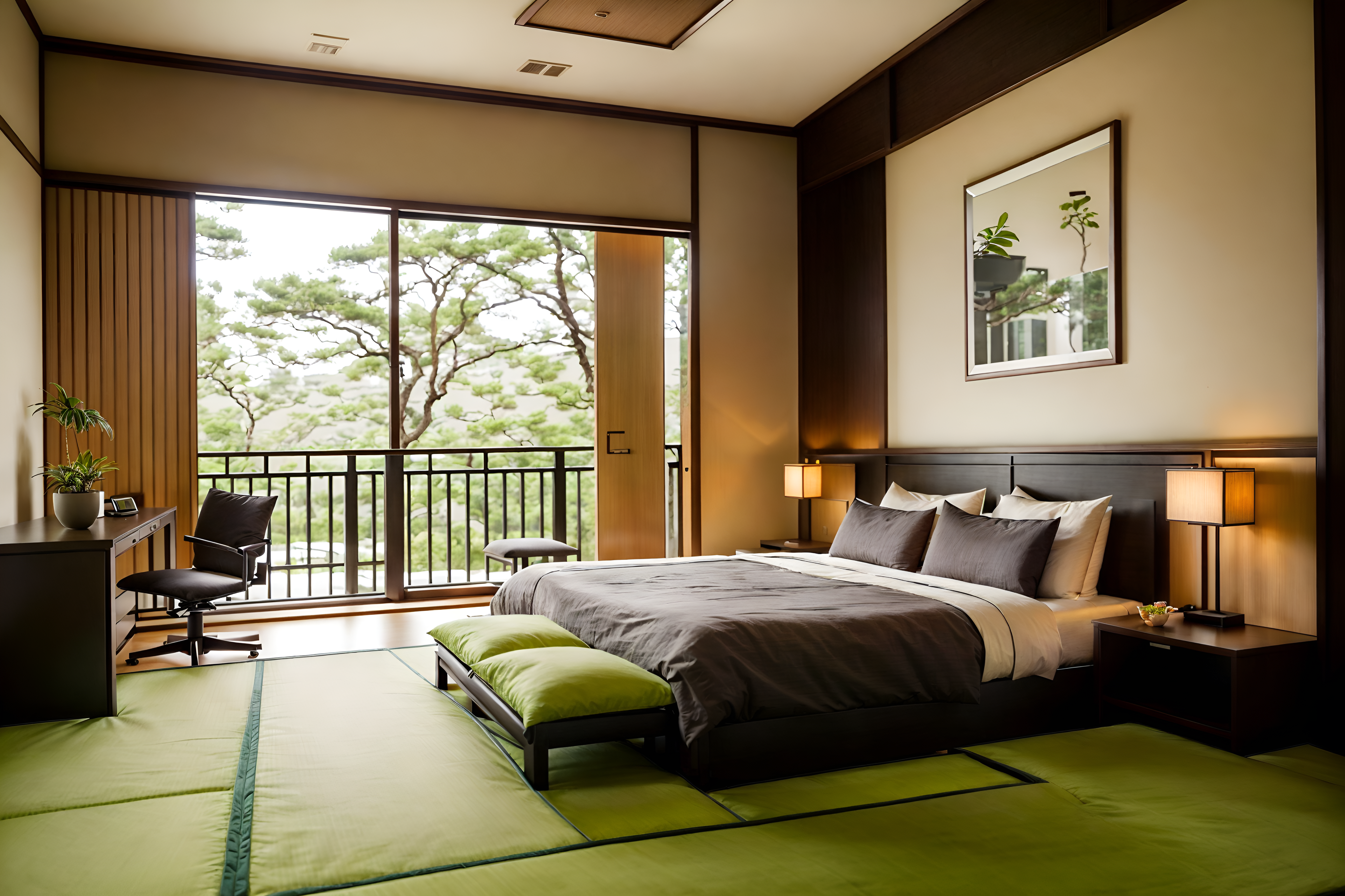 zen hotel roomsinterior decorate this hotel room with zen style. . . with bedside table or night stand and accent chair and plant and night light and hotel bathroom and bed and mirror and working desk with desk chair. . with japanese minimalist interior and japanese minimalist interior and natural light and simple furniture and japanese interior and mimimalist and asian zen interior and asian zen interior. . .
