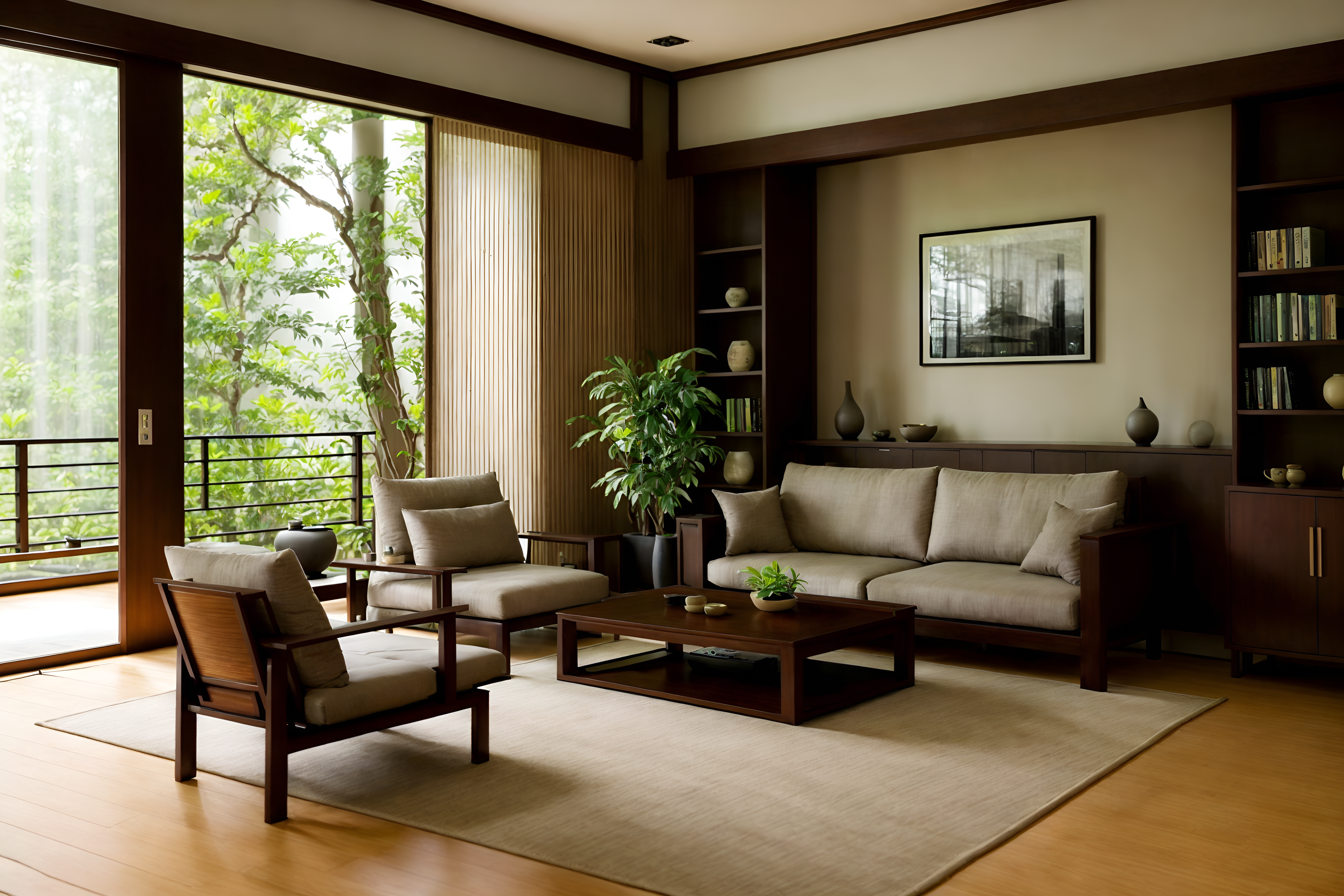 photo from pinterest of zen-style interior designed (living room interior) with furniture and bookshelves and occasional tables and coffee tables and sofa and electric lamps and plant and televisions. . with asian interior and calm and neutral colors and asian zen interior and serenity and harmony and natural textures and clean lines and japanese minimalist interior and simplicity. . cinematic photo, highly detailed, cinematic lighting, ultra-detailed, ultrarealistic, photorealism, 8k. trending on pinterest. zen interior design style. masterpiece, cinematic light, ultrarealistic+, photorealistic+, 8k, raw photo, realistic, sharp focus on eyes, (symmetrical eyes), (intact eyes), hyperrealistic, highest quality, best quality, , highly detailed, masterpiece, best quality, extremely detailed 8k wallpaper, masterpiece, best quality, ultra-detailed, best shadow, detailed background, detailed face, detailed eyes, high contrast, best illumination, detailed face, dulux, caustic, dynamic angle, detailed glow. dramatic lighting. highly detailed, insanely detailed hair, symmetrical, intricate details, professionally retouched, 8k high definition. strong bokeh. award winning photo.