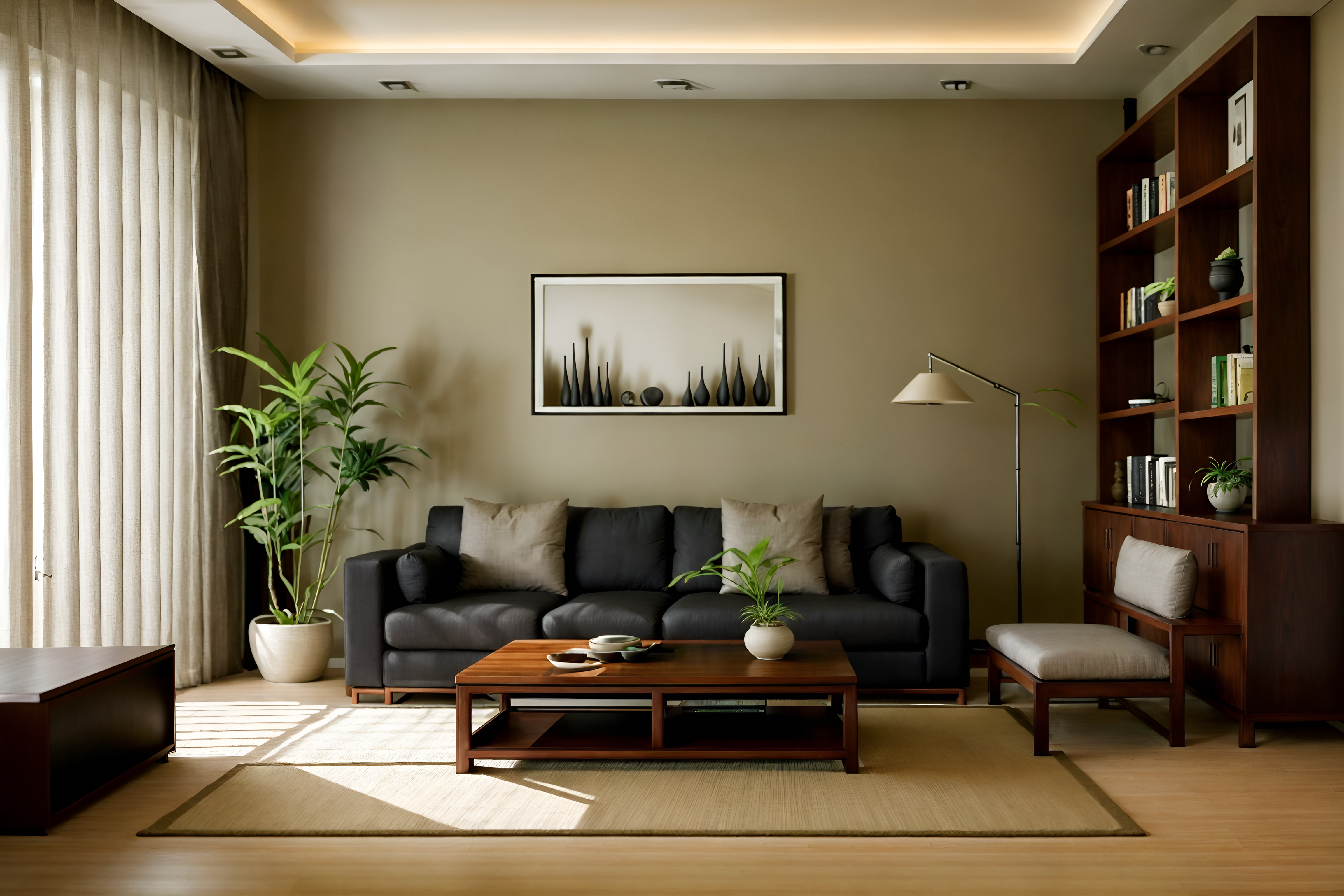 photo from pinterest of zen-style interior designed (living room interior) with furniture and bookshelves and occasional tables and coffee tables and sofa and electric lamps and plant and televisions. . with asian interior and calm and neutral colors and asian zen interior and serenity and harmony and natural textures and clean lines and japanese minimalist interior and simplicity. . cinematic photo, highly detailed, cinematic lighting, ultra-detailed, ultrarealistic, photorealism, 8k. trending on pinterest. zen interior design style. masterpiece, cinematic light, ultrarealistic+, photorealistic+, 8k, raw photo, realistic, sharp focus on eyes, (symmetrical eyes), (intact eyes), hyperrealistic, highest quality, best quality, , highly detailed, masterpiece, best quality, extremely detailed 8k wallpaper, masterpiece, best quality, ultra-detailed, best shadow, detailed background, detailed face, detailed eyes, high contrast, best illumination, detailed face, dulux, caustic, dynamic angle, detailed glow. dramatic lighting. highly detailed, insanely detailed hair, symmetrical, intricate details, professionally retouched, 8k high definition. strong bokeh. award winning photo.