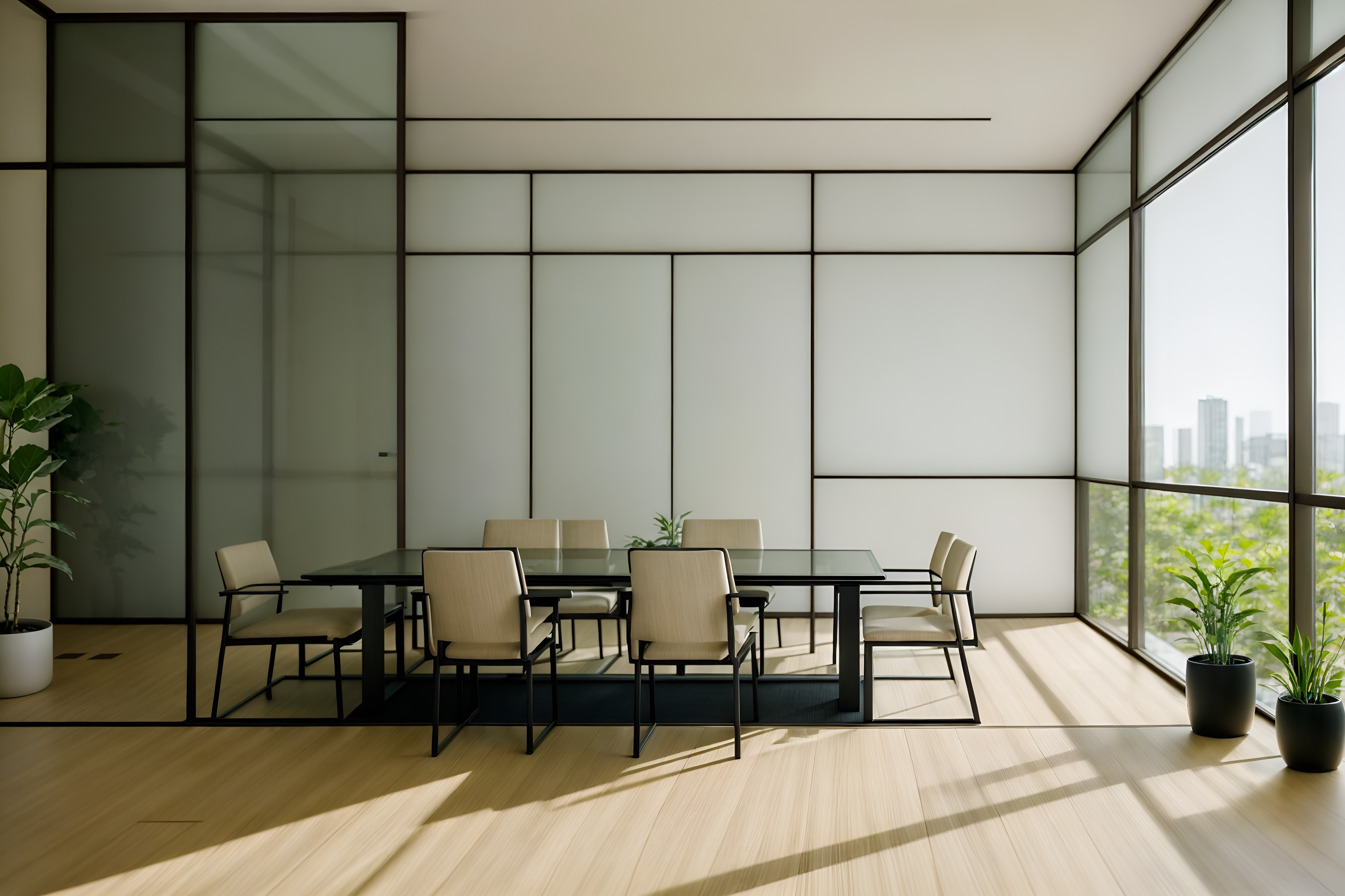 zen meeting roomsinterior decorate this meeting room with zen style. . . with glass doors and boardroom table and cabinets and plant and painting or photo on wall and glass walls and vase and office chairs. . with japanese minimalist interior and clean lines and asian zen interior and japanese minimalist interior and natural light and japanese interior and serenity and harmony and natural textures. . .