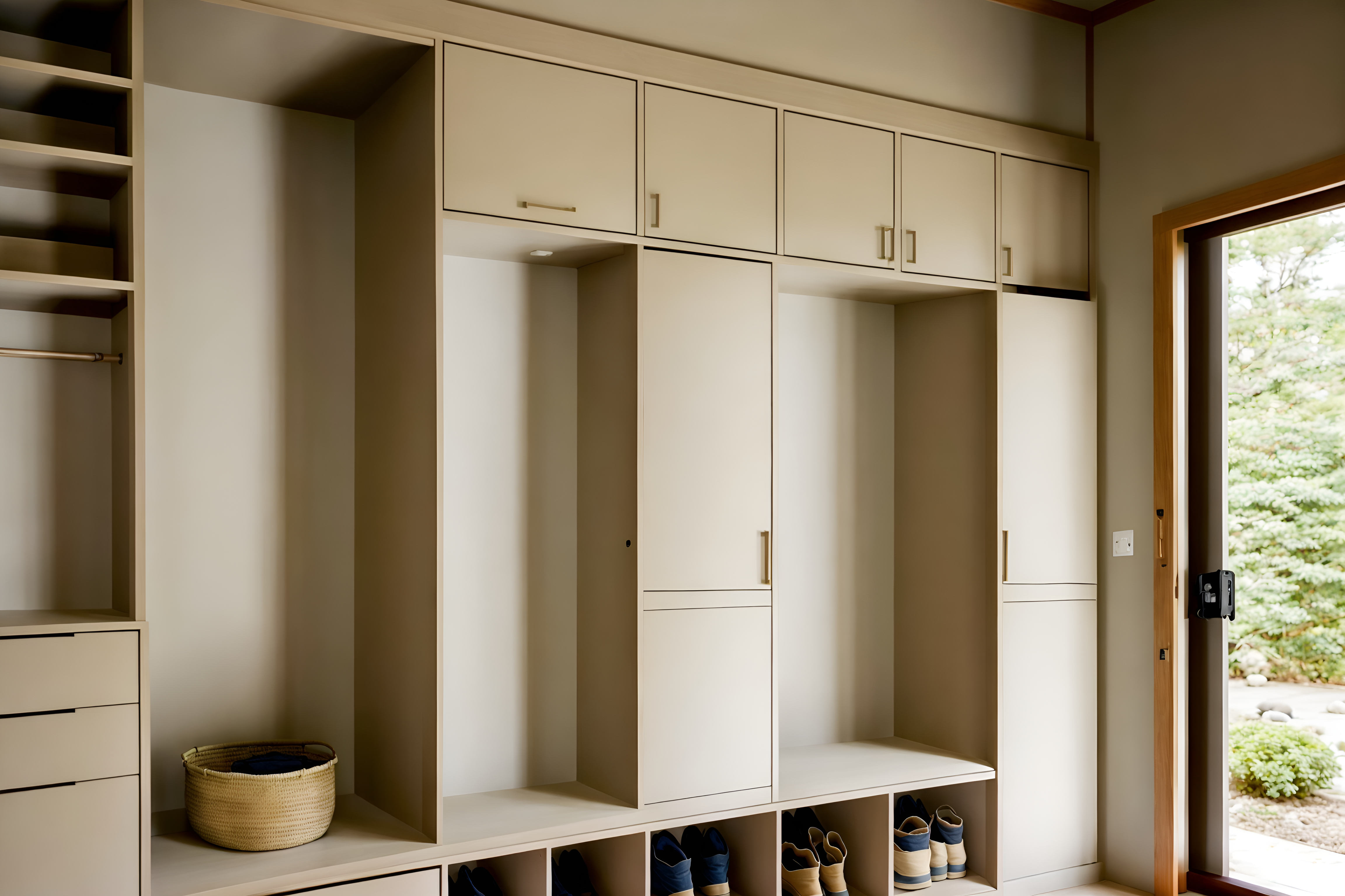 photo from pinterest of zen-style interior designed (mudroom interior) with storage baskets and wall hooks for coats and cabinets and shelves for shoes and storage drawers and cubbies and a bench and high up storage. . with asian zen interior and asian zen interior and japanese minimalist interior and serenity and harmony and simplicity and calm and neutral colors and japanese interior and japanese minimalist interior. . cinematic photo, highly detailed, cinematic lighting, ultra-detailed, ultrarealistic, photorealism, 8k. trending on pinterest. zen interior design style. masterpiece, cinematic light, ultrarealistic+, photorealistic+, 8k, raw photo, realistic, sharp focus on eyes, (symmetrical eyes), (intact eyes), hyperrealistic, highest quality, best quality, , highly detailed, masterpiece, best quality, extremely detailed 8k wallpaper, masterpiece, best quality, ultra-detailed, best shadow, detailed background, detailed face, detailed eyes, high contrast, best illumination, detailed face, dulux, caustic, dynamic angle, detailed glow. dramatic lighting. highly detailed, insanely detailed hair, symmetrical, intricate details, professionally retouched, 8k high definition. strong bokeh. award winning photo.
