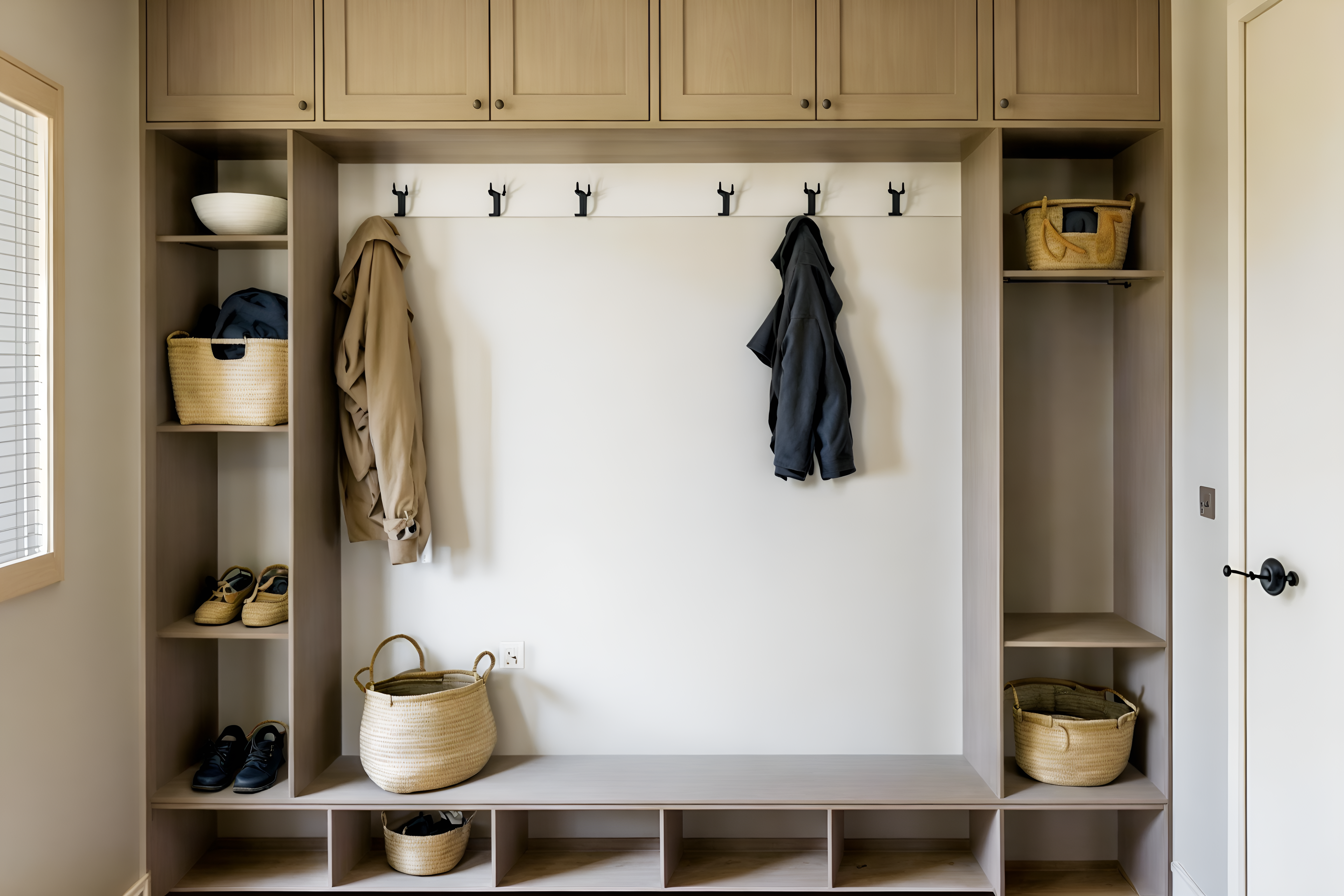 photo from pinterest of zen-style interior designed (mudroom interior) with storage baskets and wall hooks for coats and cabinets and shelves for shoes and storage drawers and cubbies and a bench and high up storage. . with asian zen interior and asian zen interior and japanese minimalist interior and serenity and harmony and simplicity and calm and neutral colors and japanese interior and japanese minimalist interior. . cinematic photo, highly detailed, cinematic lighting, ultra-detailed, ultrarealistic, photorealism, 8k. trending on pinterest. zen interior design style. masterpiece, cinematic light, ultrarealistic+, photorealistic+, 8k, raw photo, realistic, sharp focus on eyes, (symmetrical eyes), (intact eyes), hyperrealistic, highest quality, best quality, , highly detailed, masterpiece, best quality, extremely detailed 8k wallpaper, masterpiece, best quality, ultra-detailed, best shadow, detailed background, detailed face, detailed eyes, high contrast, best illumination, detailed face, dulux, caustic, dynamic angle, detailed glow. dramatic lighting. highly detailed, insanely detailed hair, symmetrical, intricate details, professionally retouched, 8k high definition. strong bokeh. award winning photo.