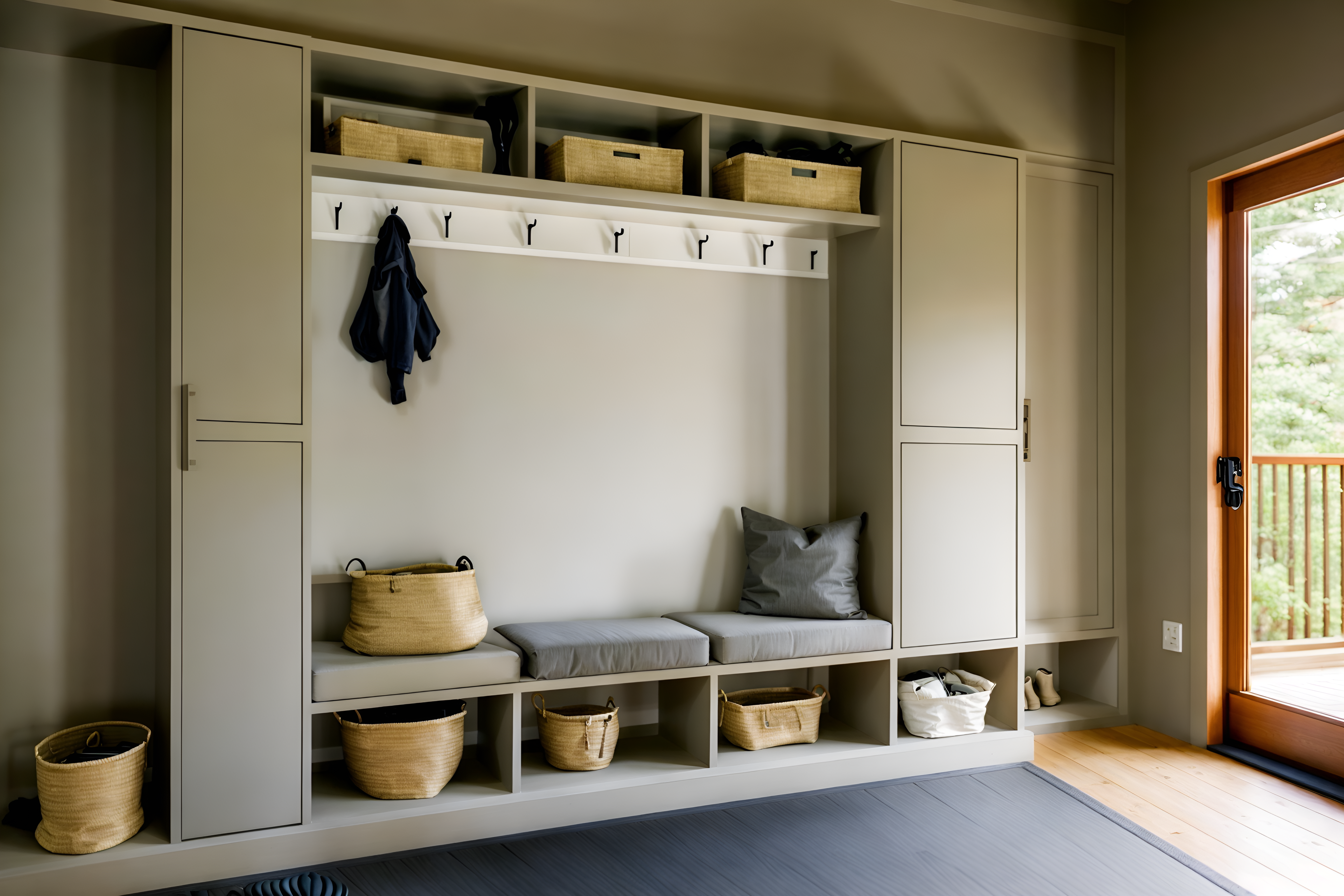 photo from pinterest of zen-style interior designed (mudroom interior) with storage baskets and wall hooks for coats and cabinets and shelves for shoes and storage drawers and cubbies and a bench and high up storage. . with asian zen interior and asian zen interior and japanese minimalist interior and serenity and harmony and simplicity and calm and neutral colors and japanese interior and japanese minimalist interior. . cinematic photo, highly detailed, cinematic lighting, ultra-detailed, ultrarealistic, photorealism, 8k. trending on pinterest. zen interior design style. masterpiece, cinematic light, ultrarealistic+, photorealistic+, 8k, raw photo, realistic, sharp focus on eyes, (symmetrical eyes), (intact eyes), hyperrealistic, highest quality, best quality, , highly detailed, masterpiece, best quality, extremely detailed 8k wallpaper, masterpiece, best quality, ultra-detailed, best shadow, detailed background, detailed face, detailed eyes, high contrast, best illumination, detailed face, dulux, caustic, dynamic angle, detailed glow. dramatic lighting. highly detailed, insanely detailed hair, symmetrical, intricate details, professionally retouched, 8k high definition. strong bokeh. award winning photo.