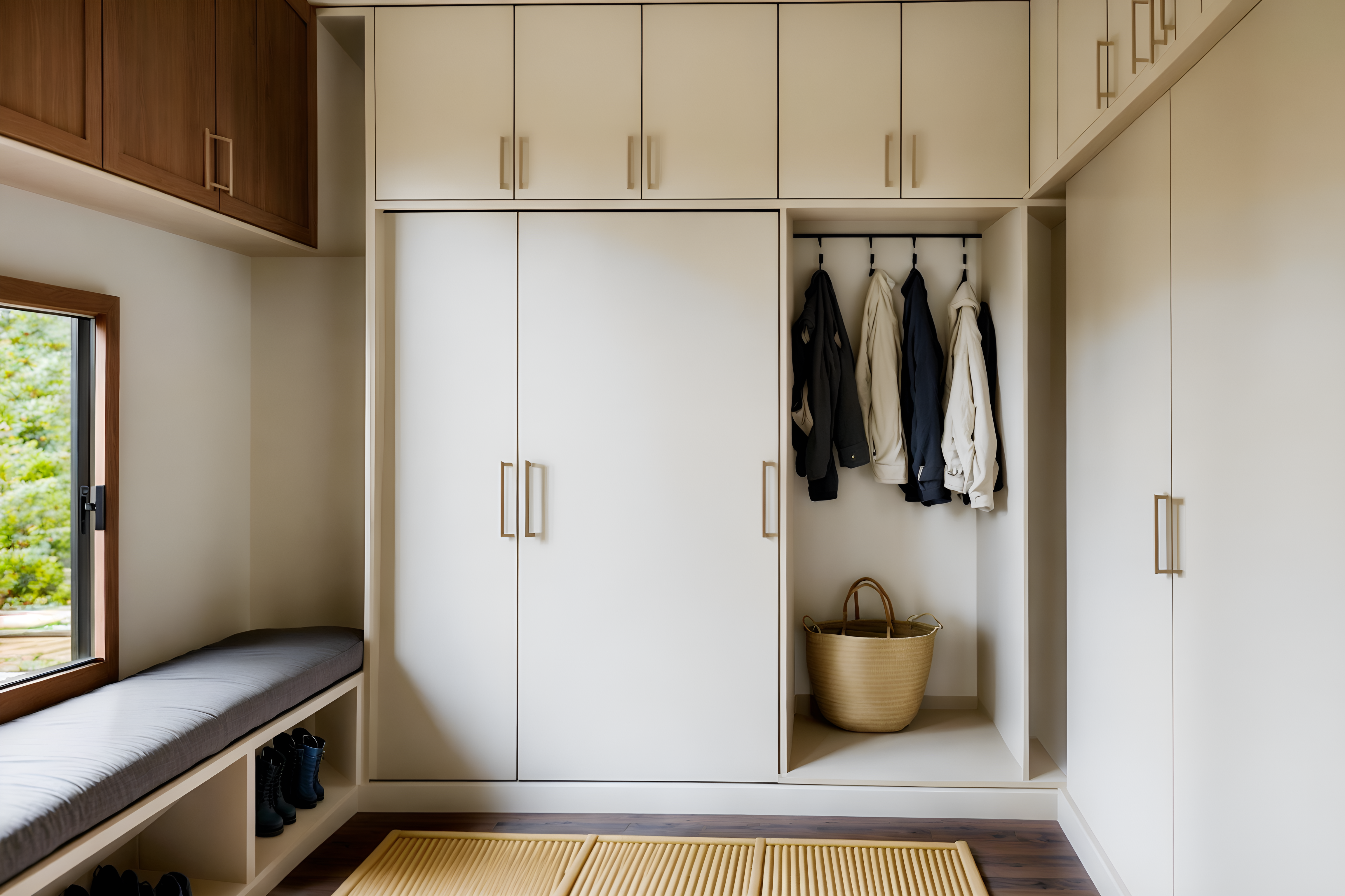 photo from pinterest of zen-style interior designed (mudroom interior) with storage baskets and wall hooks for coats and cabinets and shelves for shoes and storage drawers and cubbies and a bench and high up storage. . with asian zen interior and asian zen interior and japanese minimalist interior and serenity and harmony and simplicity and calm and neutral colors and japanese interior and japanese minimalist interior. . cinematic photo, highly detailed, cinematic lighting, ultra-detailed, ultrarealistic, photorealism, 8k. trending on pinterest. zen interior design style. masterpiece, cinematic light, ultrarealistic+, photorealistic+, 8k, raw photo, realistic, sharp focus on eyes, (symmetrical eyes), (intact eyes), hyperrealistic, highest quality, best quality, , highly detailed, masterpiece, best quality, extremely detailed 8k wallpaper, masterpiece, best quality, ultra-detailed, best shadow, detailed background, detailed face, detailed eyes, high contrast, best illumination, detailed face, dulux, caustic, dynamic angle, detailed glow. dramatic lighting. highly detailed, insanely detailed hair, symmetrical, intricate details, professionally retouched, 8k high definition. strong bokeh. award winning photo.