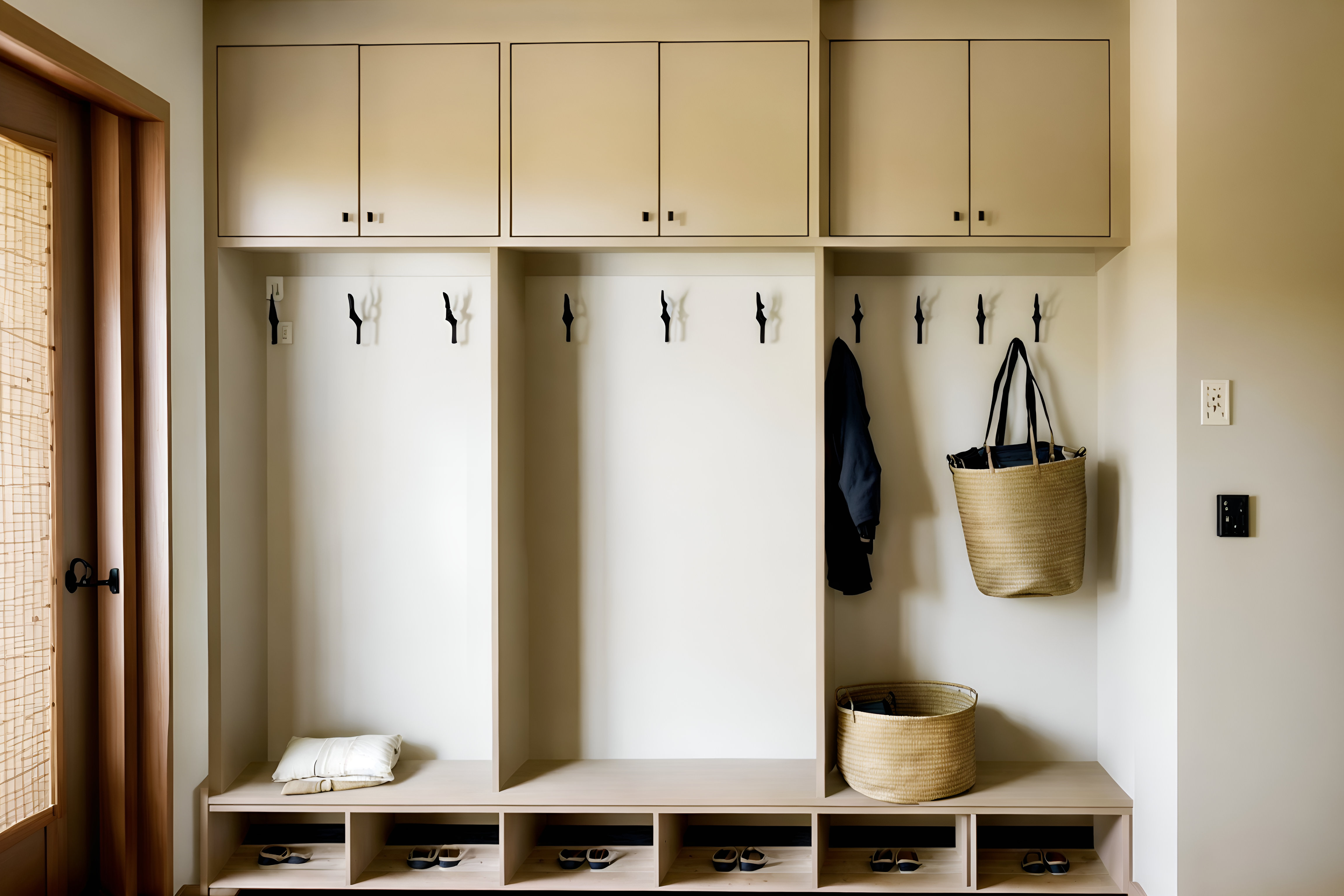 photo from pinterest of zen-style interior designed (mudroom interior) with storage baskets and wall hooks for coats and cabinets and shelves for shoes and storage drawers and cubbies and a bench and high up storage. . with asian zen interior and asian zen interior and japanese minimalist interior and serenity and harmony and simplicity and calm and neutral colors and japanese interior and japanese minimalist interior. . cinematic photo, highly detailed, cinematic lighting, ultra-detailed, ultrarealistic, photorealism, 8k. trending on pinterest. zen interior design style. masterpiece, cinematic light, ultrarealistic+, photorealistic+, 8k, raw photo, realistic, sharp focus on eyes, (symmetrical eyes), (intact eyes), hyperrealistic, highest quality, best quality, , highly detailed, masterpiece, best quality, extremely detailed 8k wallpaper, masterpiece, best quality, ultra-detailed, best shadow, detailed background, detailed face, detailed eyes, high contrast, best illumination, detailed face, dulux, caustic, dynamic angle, detailed glow. dramatic lighting. highly detailed, insanely detailed hair, symmetrical, intricate details, professionally retouched, 8k high definition. strong bokeh. award winning photo.