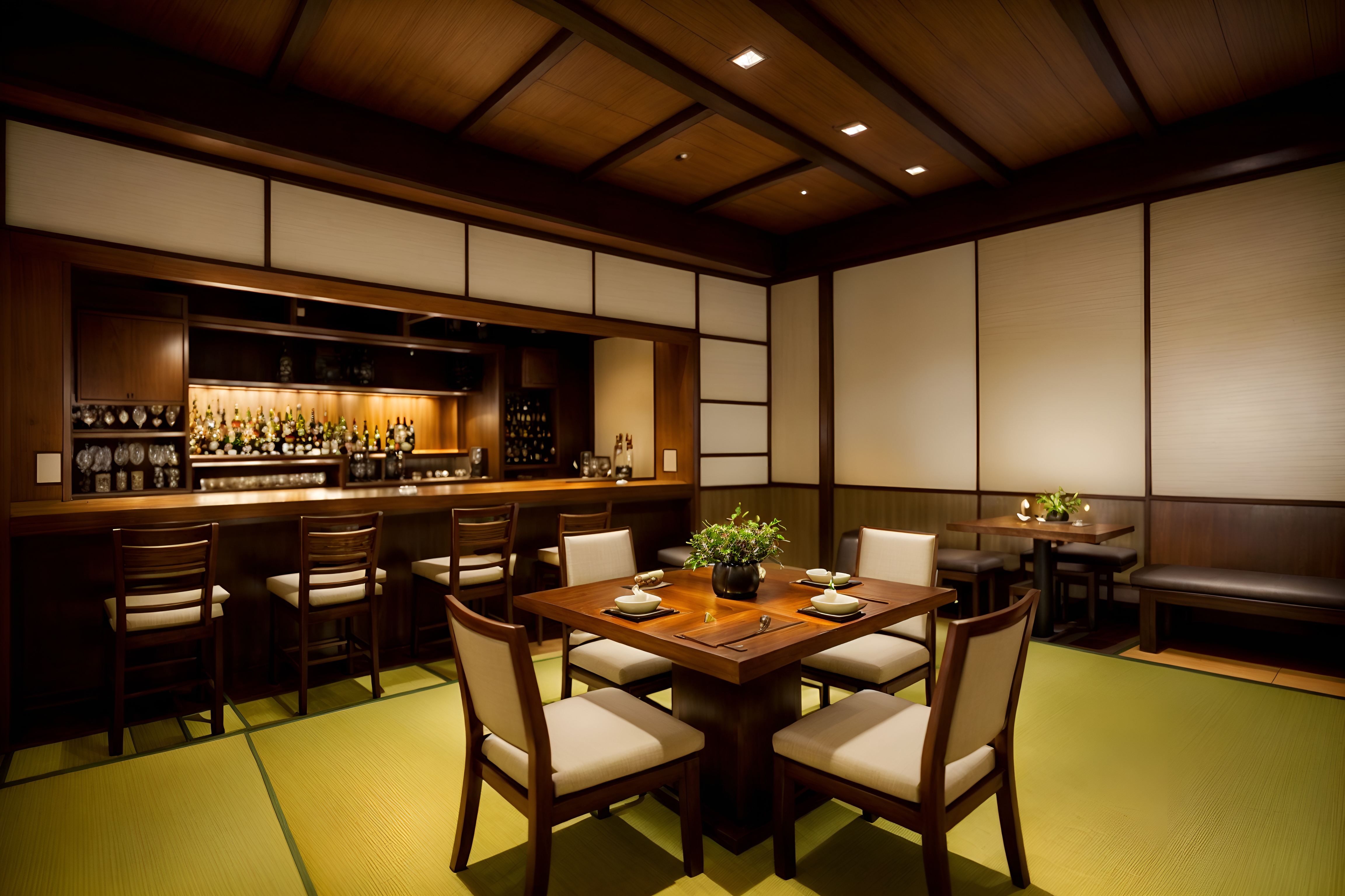 photo from pinterest of zen-style interior designed (restaurant interior) with restaurant decor and restaurant bar and restaurant chairs and restaurant dining tables and restaurant decor. . with japanese interior and asian zen interior and clean lines and calm and neutral colors and simplicity and serenity and harmony and mimimalist and clutter free. . cinematic photo, highly detailed, cinematic lighting, ultra-detailed, ultrarealistic, photorealism, 8k. trending on pinterest. zen interior design style. masterpiece, cinematic light, ultrarealistic+, photorealistic+, 8k, raw photo, realistic, sharp focus on eyes, (symmetrical eyes), (intact eyes), hyperrealistic, highest quality, best quality, , highly detailed, masterpiece, best quality, extremely detailed 8k wallpaper, masterpiece, best quality, ultra-detailed, best shadow, detailed background, detailed face, detailed eyes, high contrast, best illumination, detailed face, dulux, caustic, dynamic angle, detailed glow. dramatic lighting. highly detailed, insanely detailed hair, symmetrical, intricate details, professionally retouched, 8k high definition. strong bokeh. award winning photo.