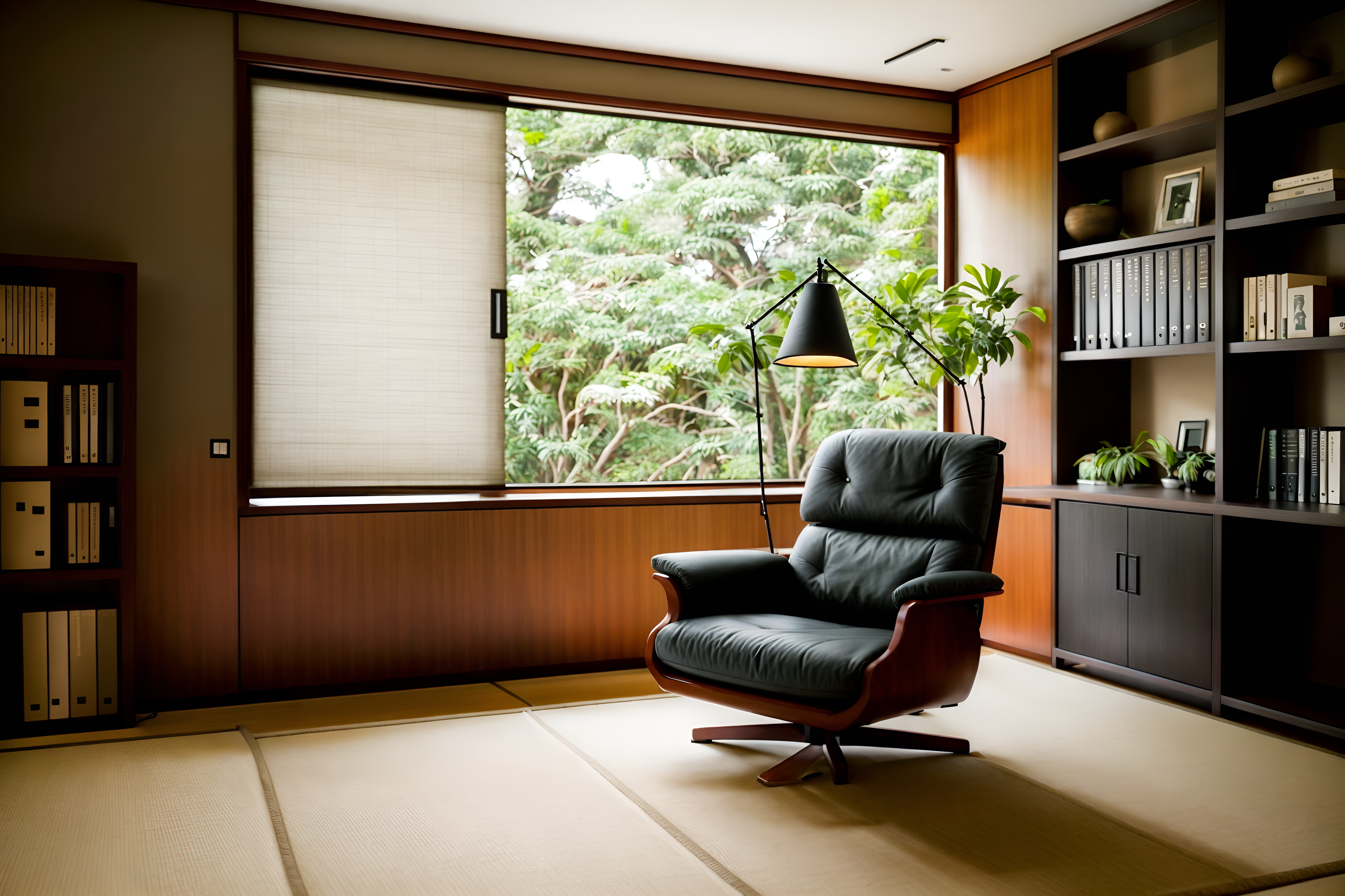 photo from pinterest of zen-style interior designed (study room interior) with lounge chair and bookshelves and plant and writing desk and desk lamp and cabinets and office chair and lounge chair. . with asian zen interior and japanese minimalist interior and asian zen interior and clean lines and simple furniture and serenity and harmony and asian interior and japanese minimalist interior. . cinematic photo, highly detailed, cinematic lighting, ultra-detailed, ultrarealistic, photorealism, 8k. trending on pinterest. zen interior design style. masterpiece, cinematic light, ultrarealistic+, photorealistic+, 8k, raw photo, realistic, sharp focus on eyes, (symmetrical eyes), (intact eyes), hyperrealistic, highest quality, best quality, , highly detailed, masterpiece, best quality, extremely detailed 8k wallpaper, masterpiece, best quality, ultra-detailed, best shadow, detailed background, detailed face, detailed eyes, high contrast, best illumination, detailed face, dulux, caustic, dynamic angle, detailed glow. dramatic lighting. highly detailed, insanely detailed hair, symmetrical, intricate details, professionally retouched, 8k high definition. strong bokeh. award winning photo.