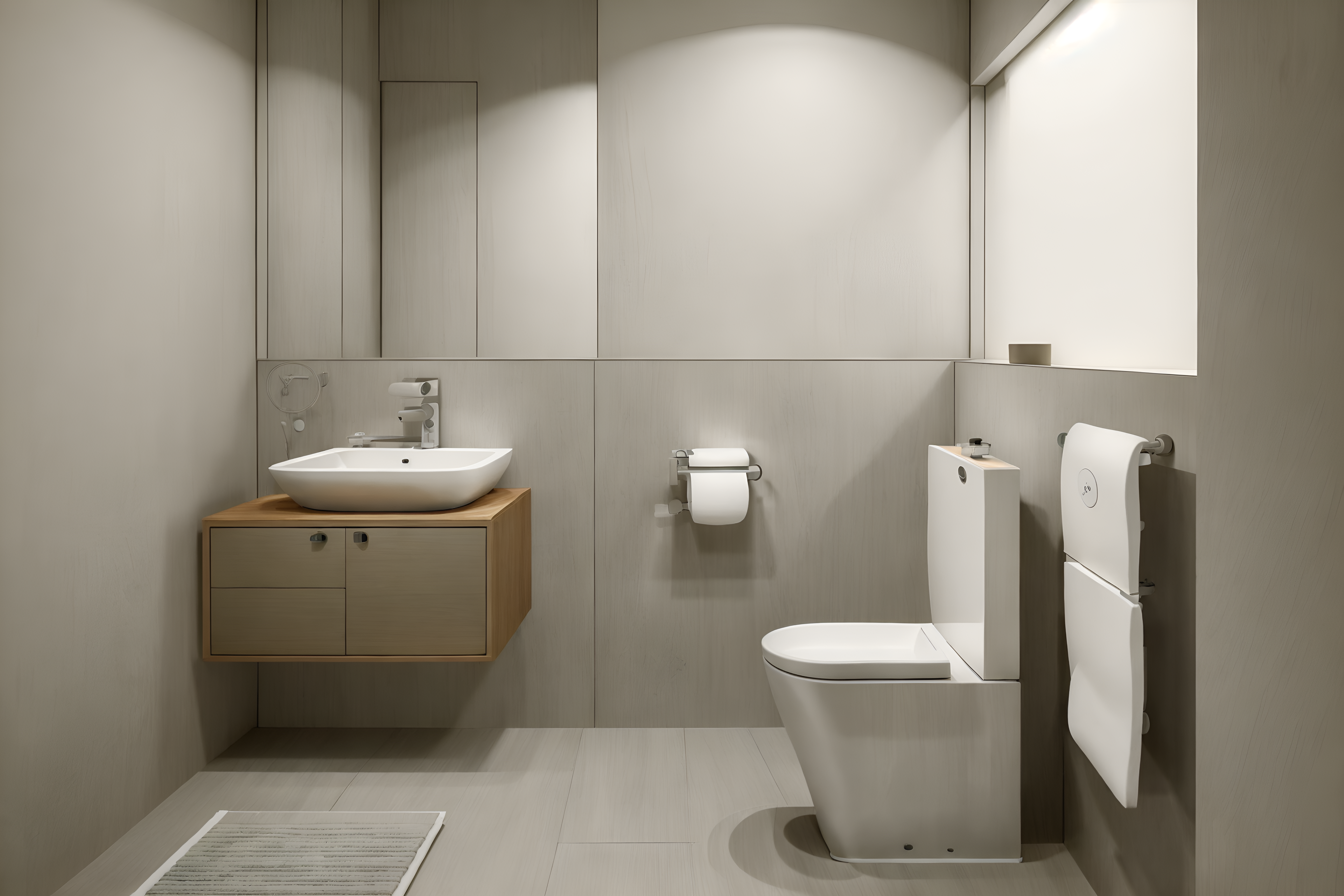 zen toiletsinterior decorate this toilet with zen style. . . with toilet paper hanger and sink with tap and toilet with toilet seat up and toilet paper hanger. . with simple furniture and asian interior and asian zen interior and japanese minimalist interior and calm and neutral colors and simplicity and mimimalist and clean lines. . .